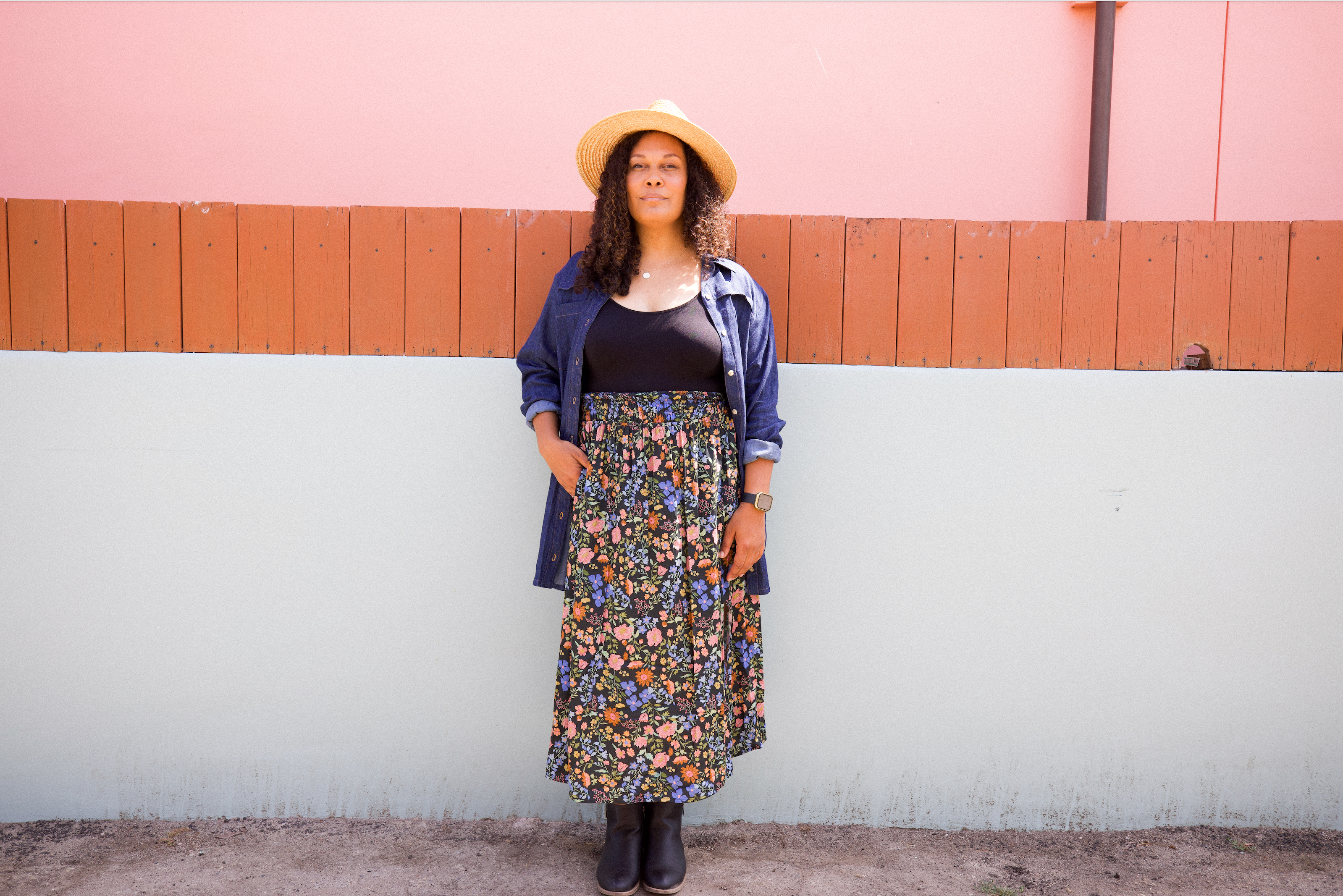 Crafted from a viscose-cotton blend, this skirt features a vibrant floral print that pops against a black base. The side slit adds easy movement and a touch of flirt, while the pockets make it effortlessly practical. Perfectly pairs with all of our boxy crop tops or your favorite simple tee.