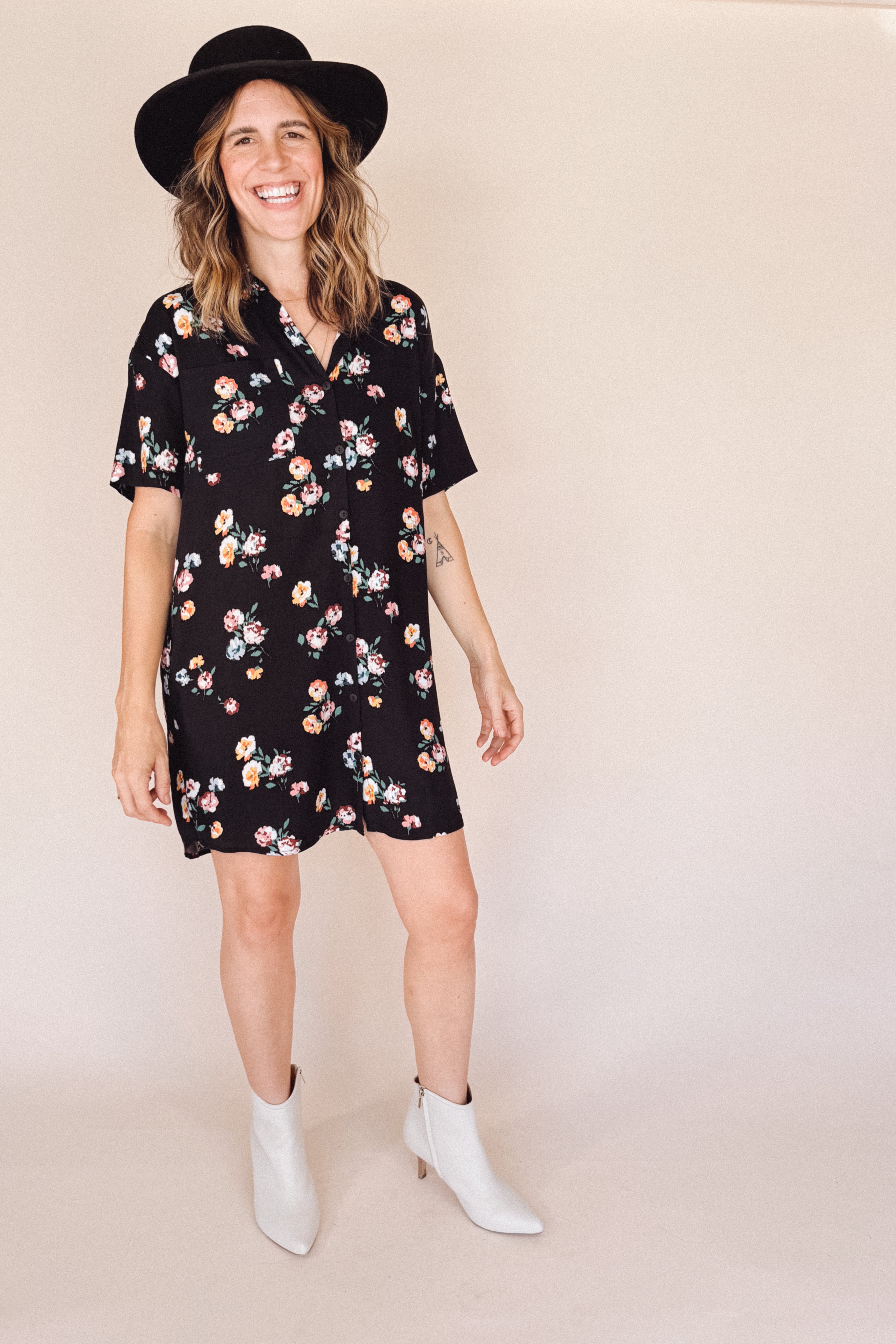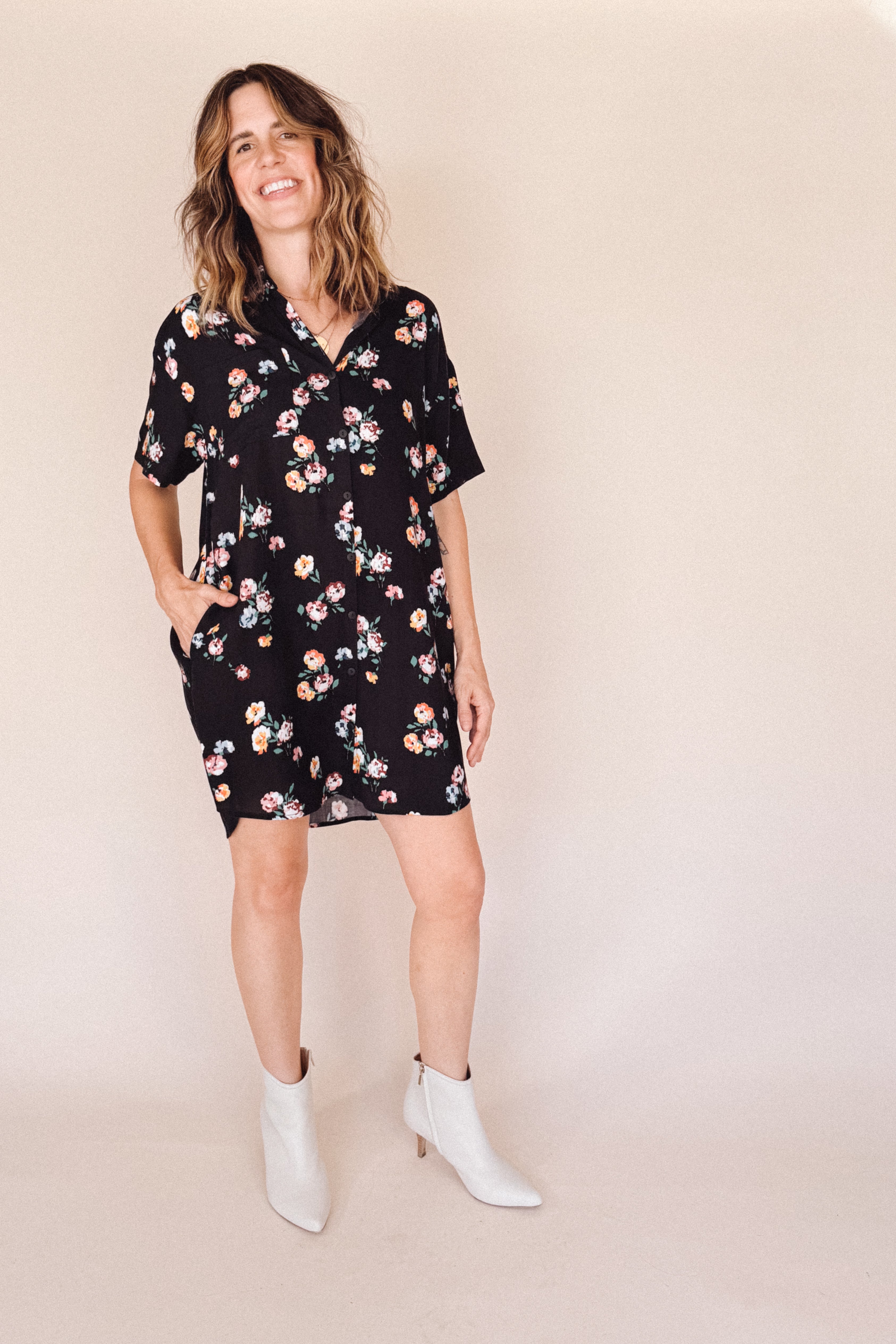 Meet Avery, your easy, wear-everywhere mini shirtdress—now in the Blurred Flower print. This short-sleeve, collared button-up slips on with a relaxed drape and slight dropped shoulder for effortless ease. A center-back pleat (for extra room across the shoulders), breast pocket, and side-seam pockets make it as functional as it is cute. Finished with a curved mini hem that moves with you in soft challis fabric gives effortless movement. Wear it casually with sneakers or chunky combat boots or dress it up with heeled booties, jewelry and a leather jacket.