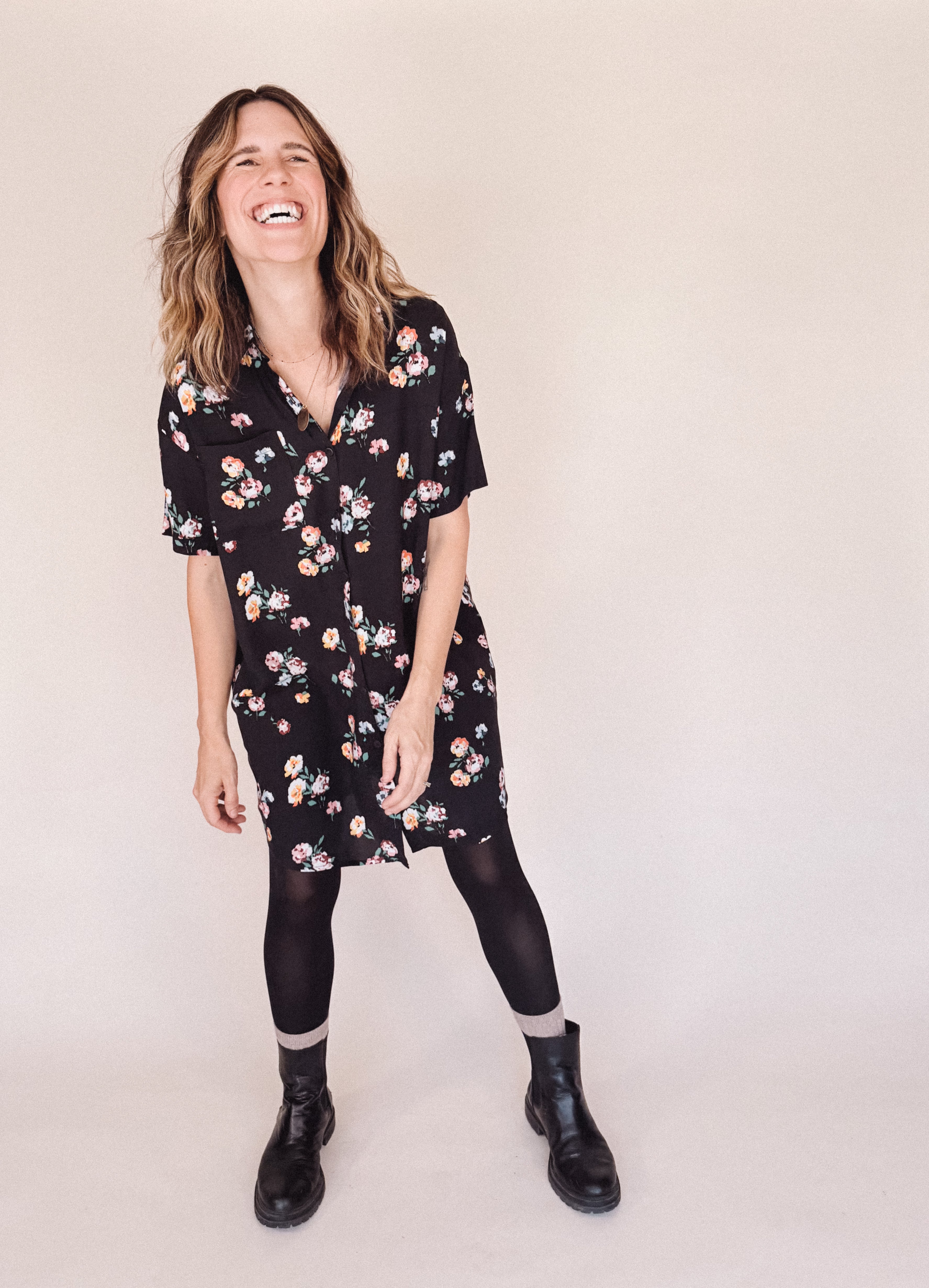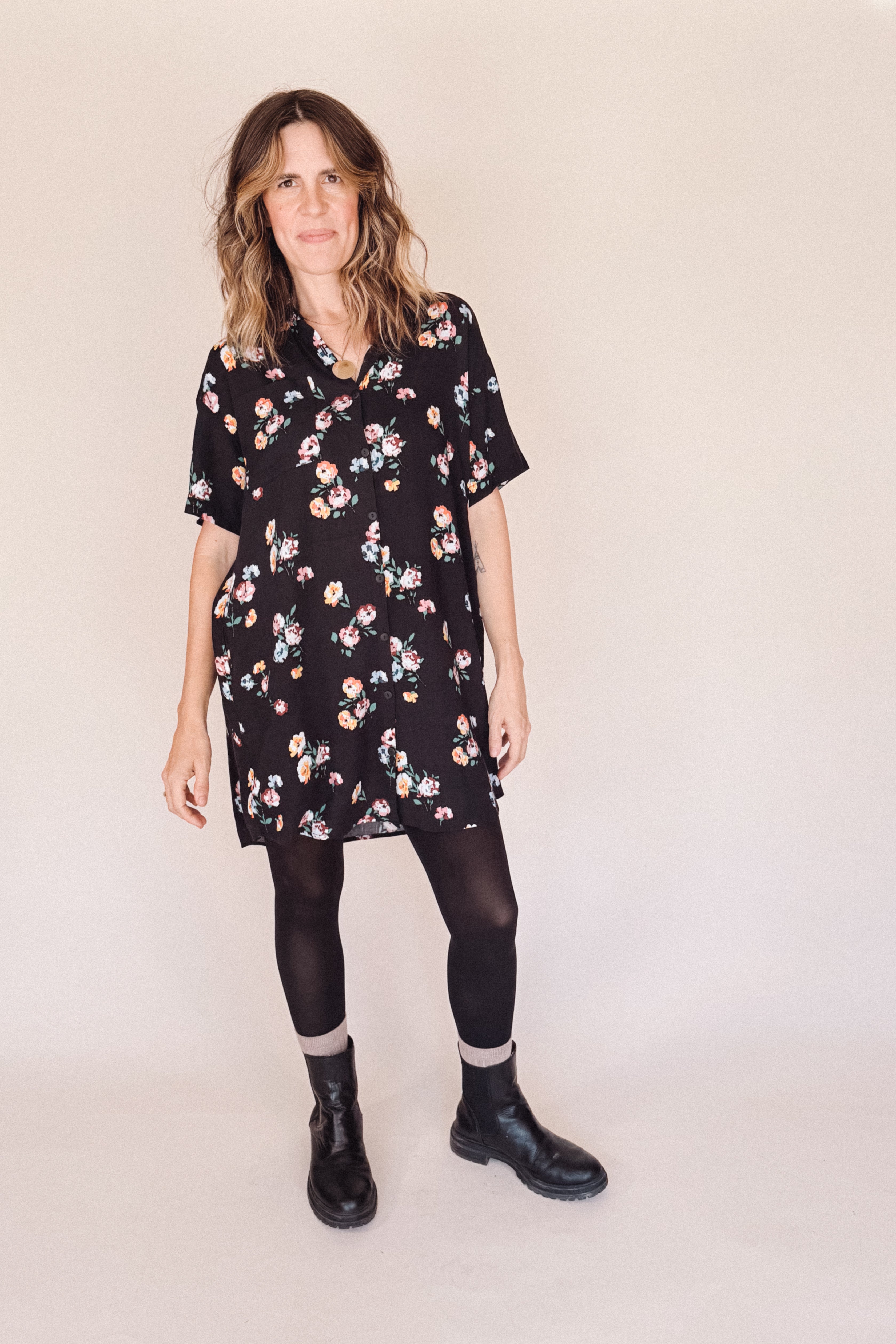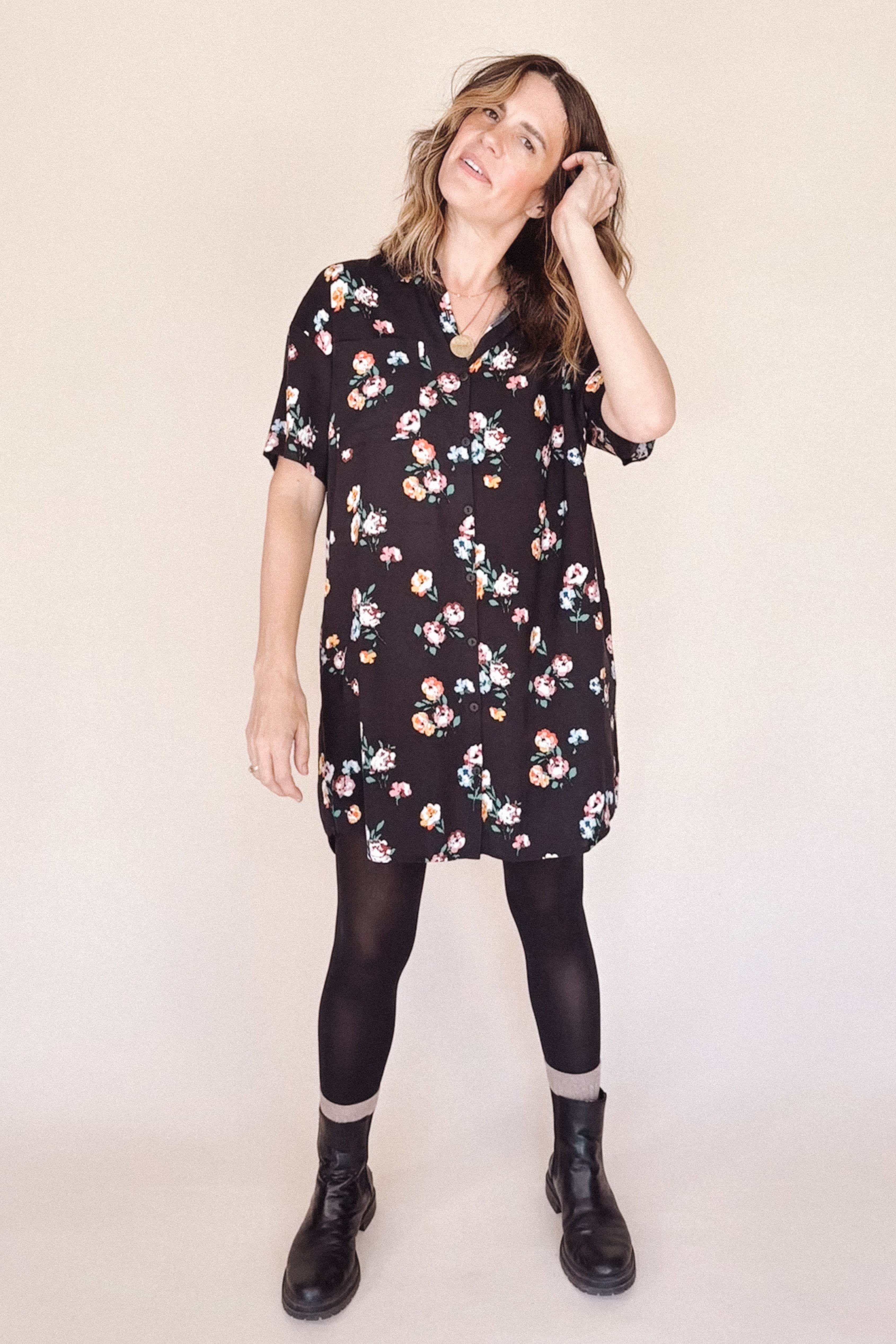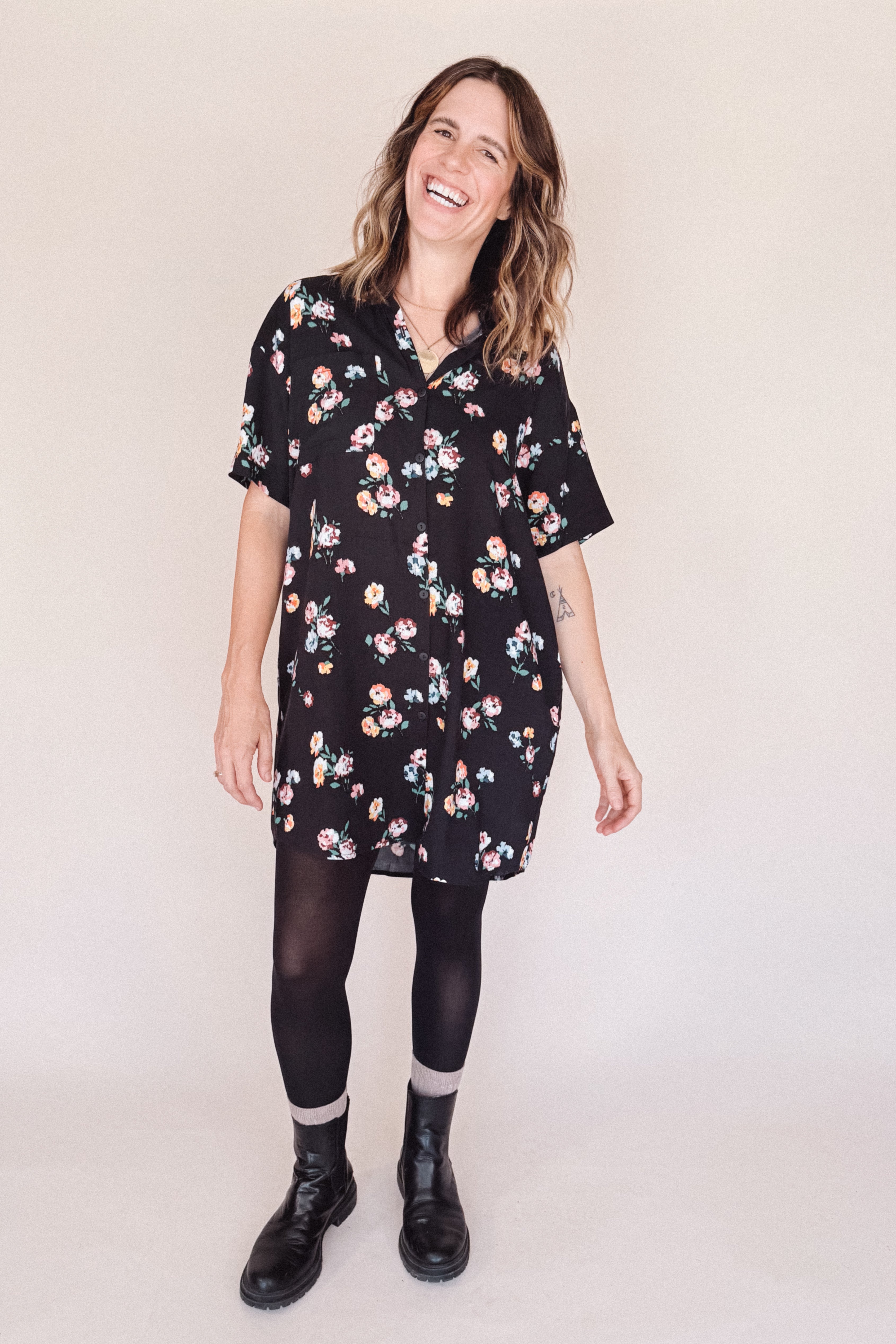 - Buttoned with tights and boots for fall; unbuttoned over a tank and denim for warm days.