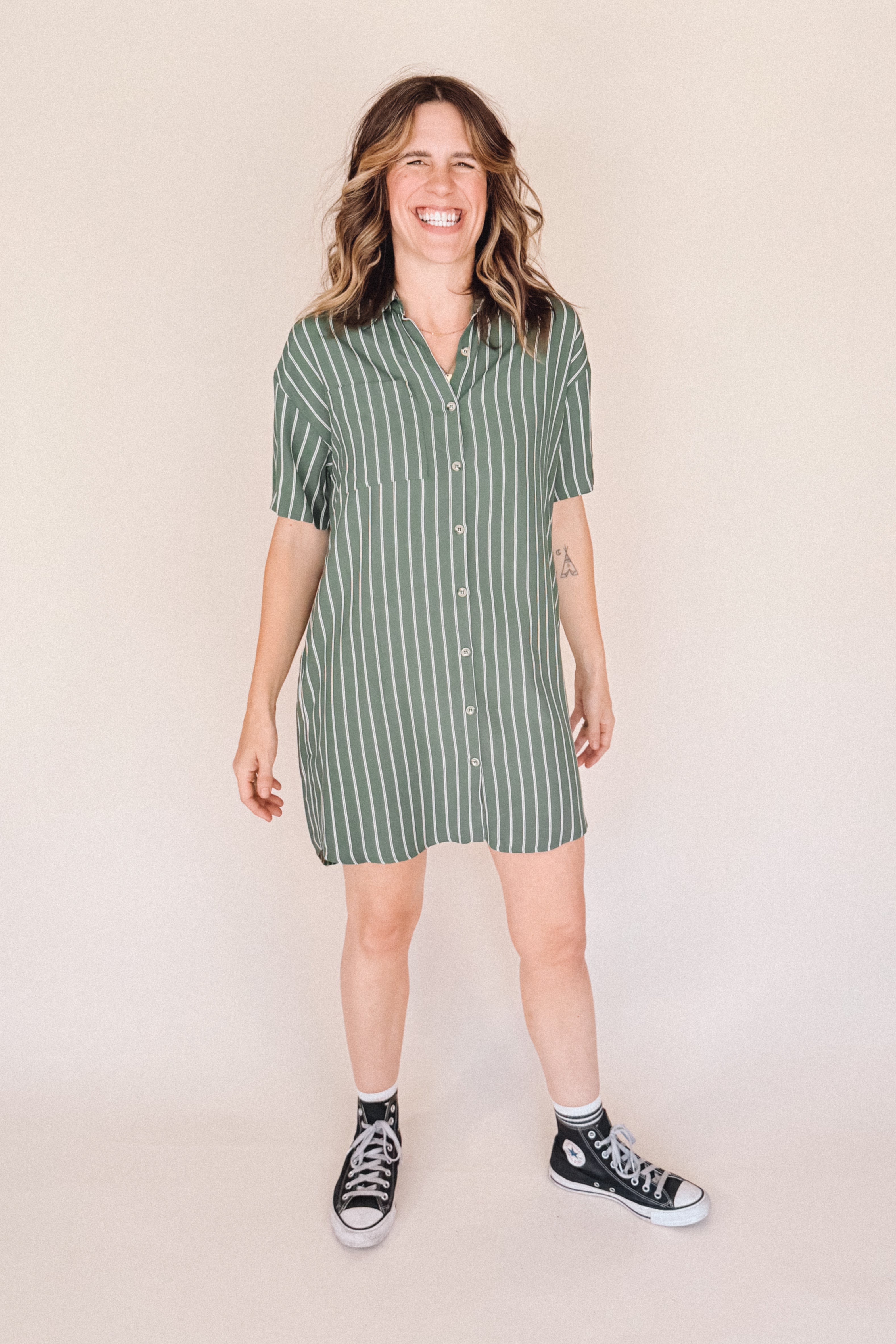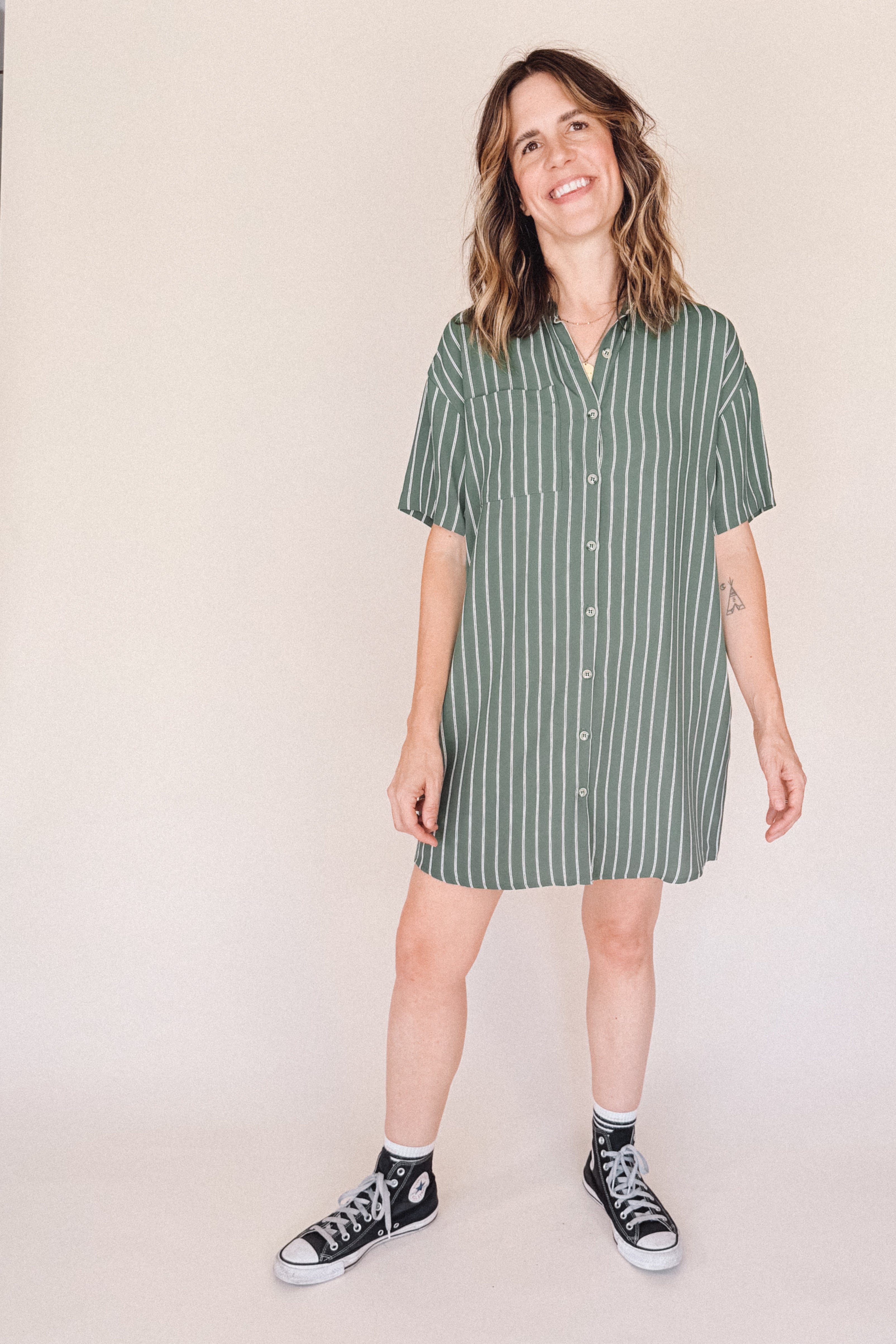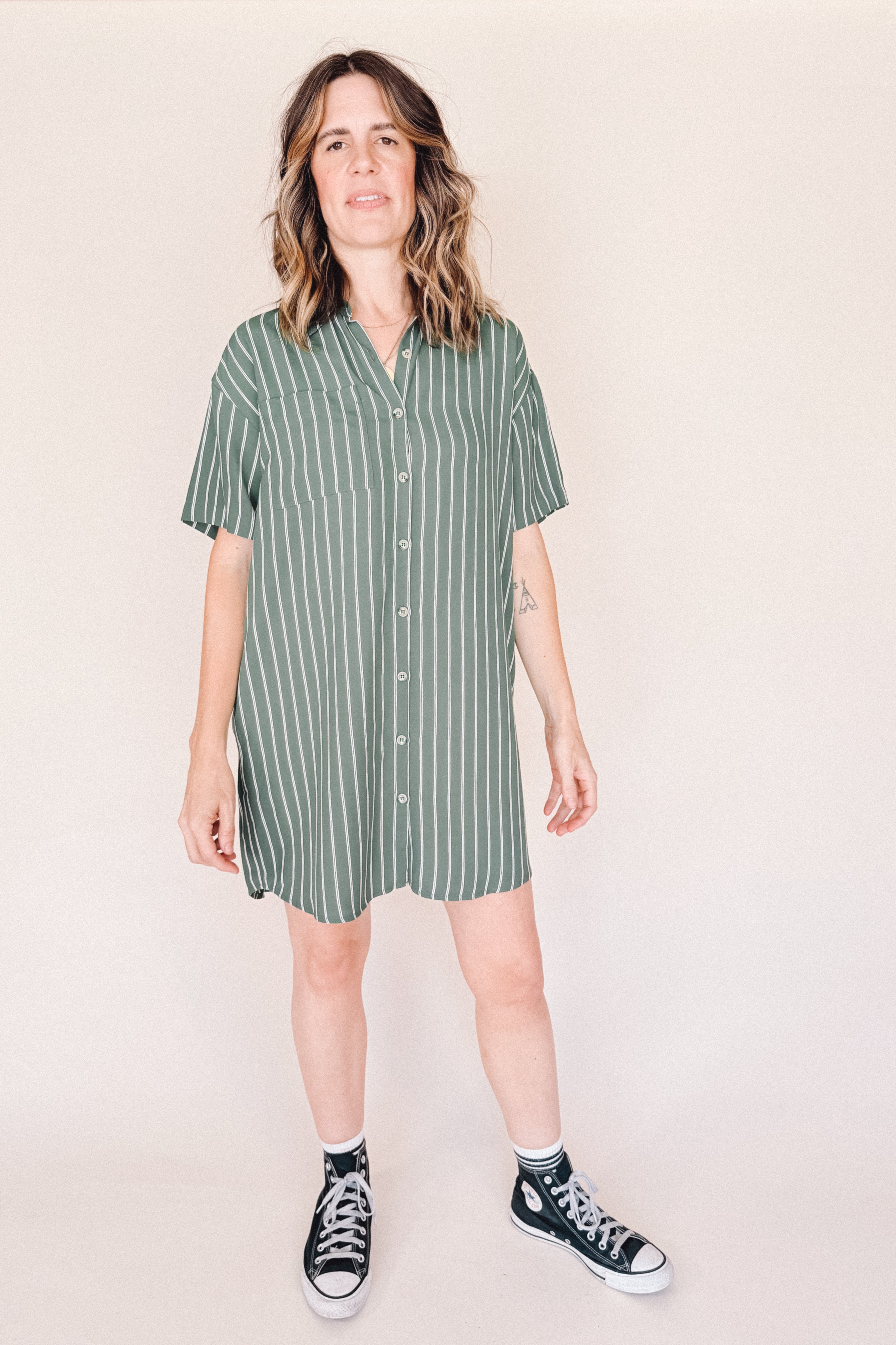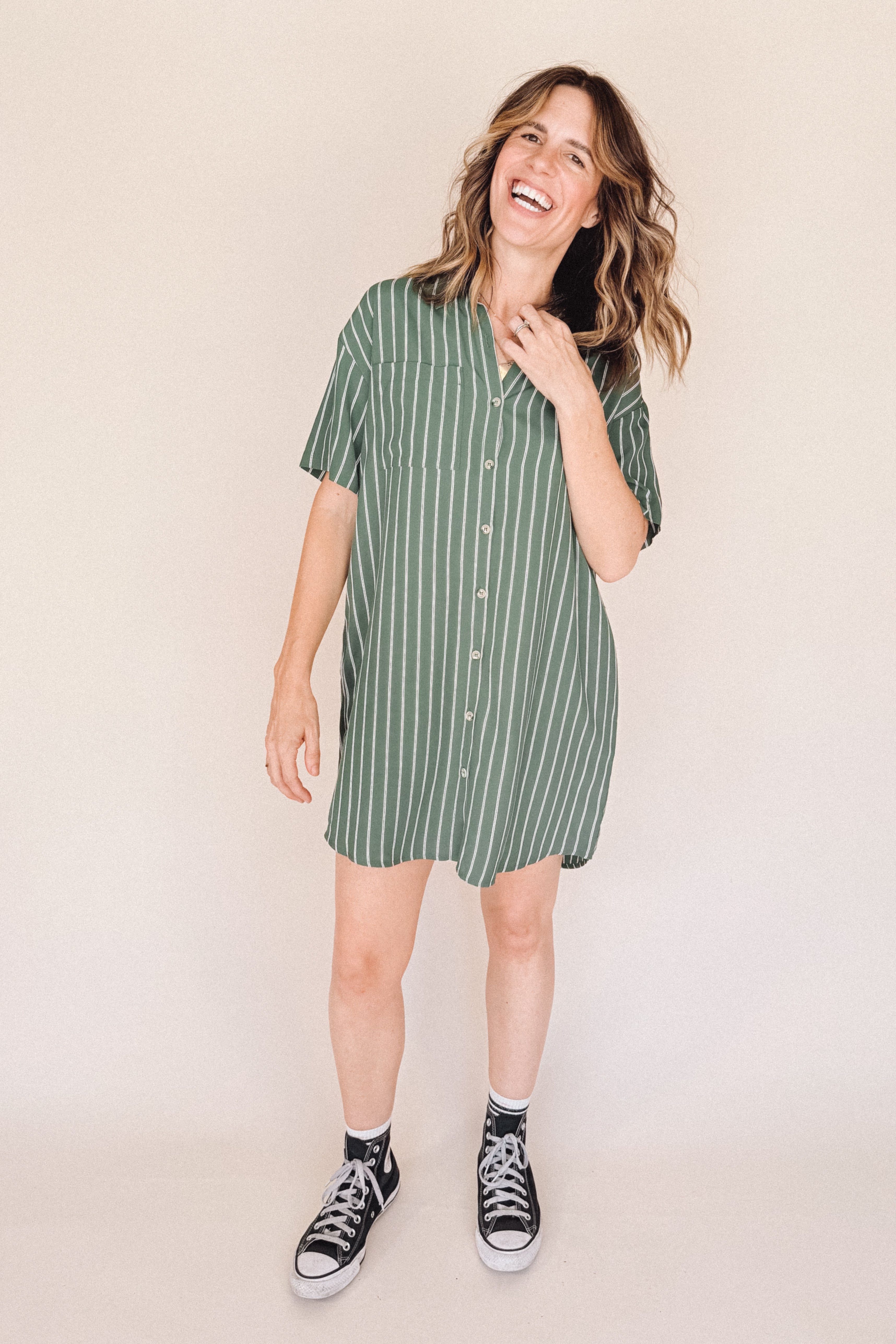 AVERY-Short Sleeve Button-Up Mini Shirt Dress Green stripe– Collared, Back Pleat & Pockets (Wear Two Ways)