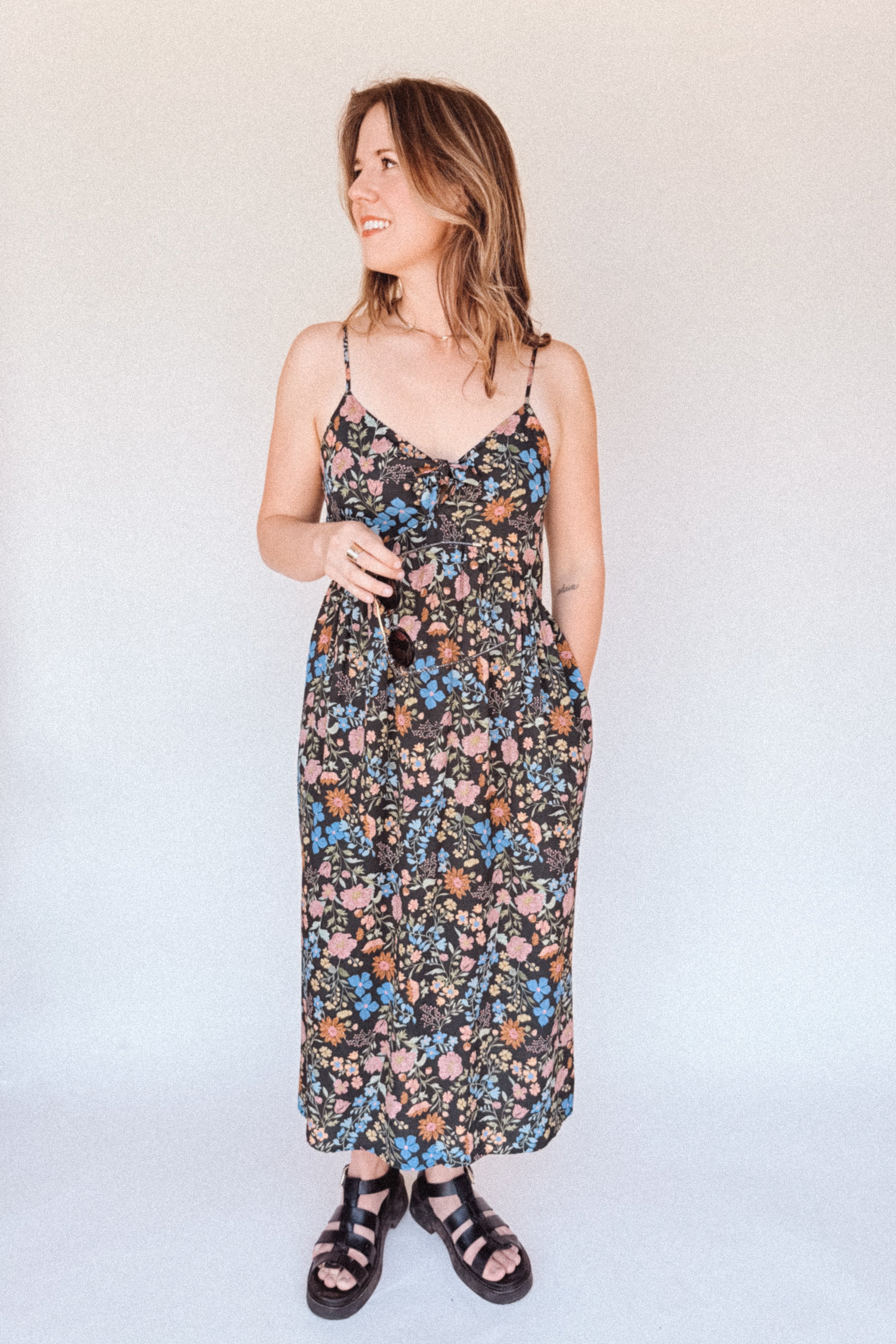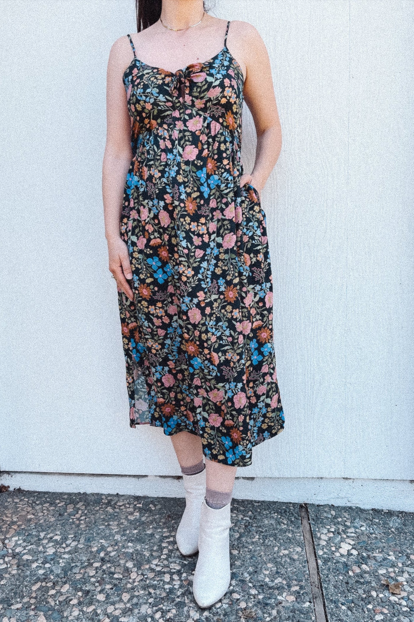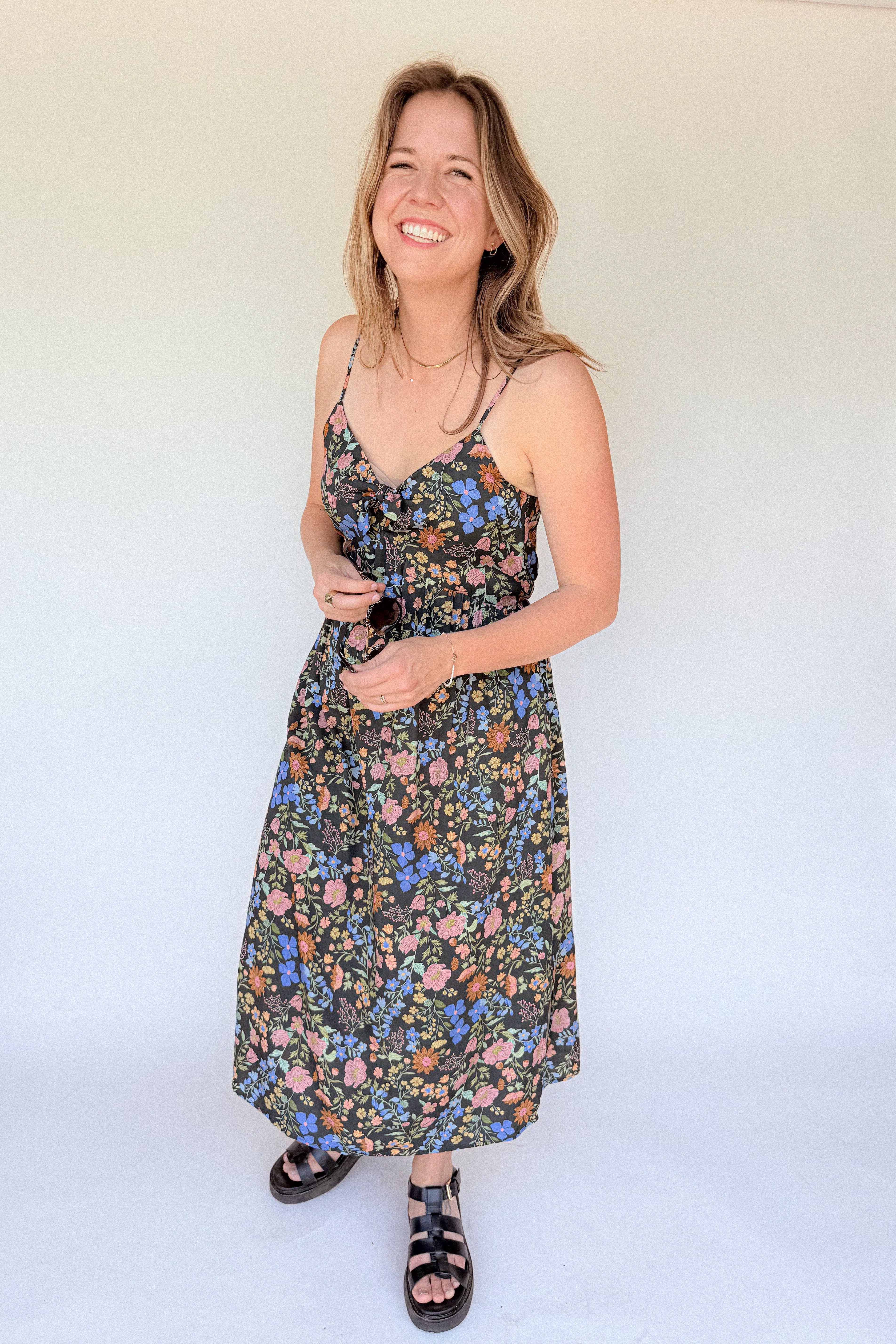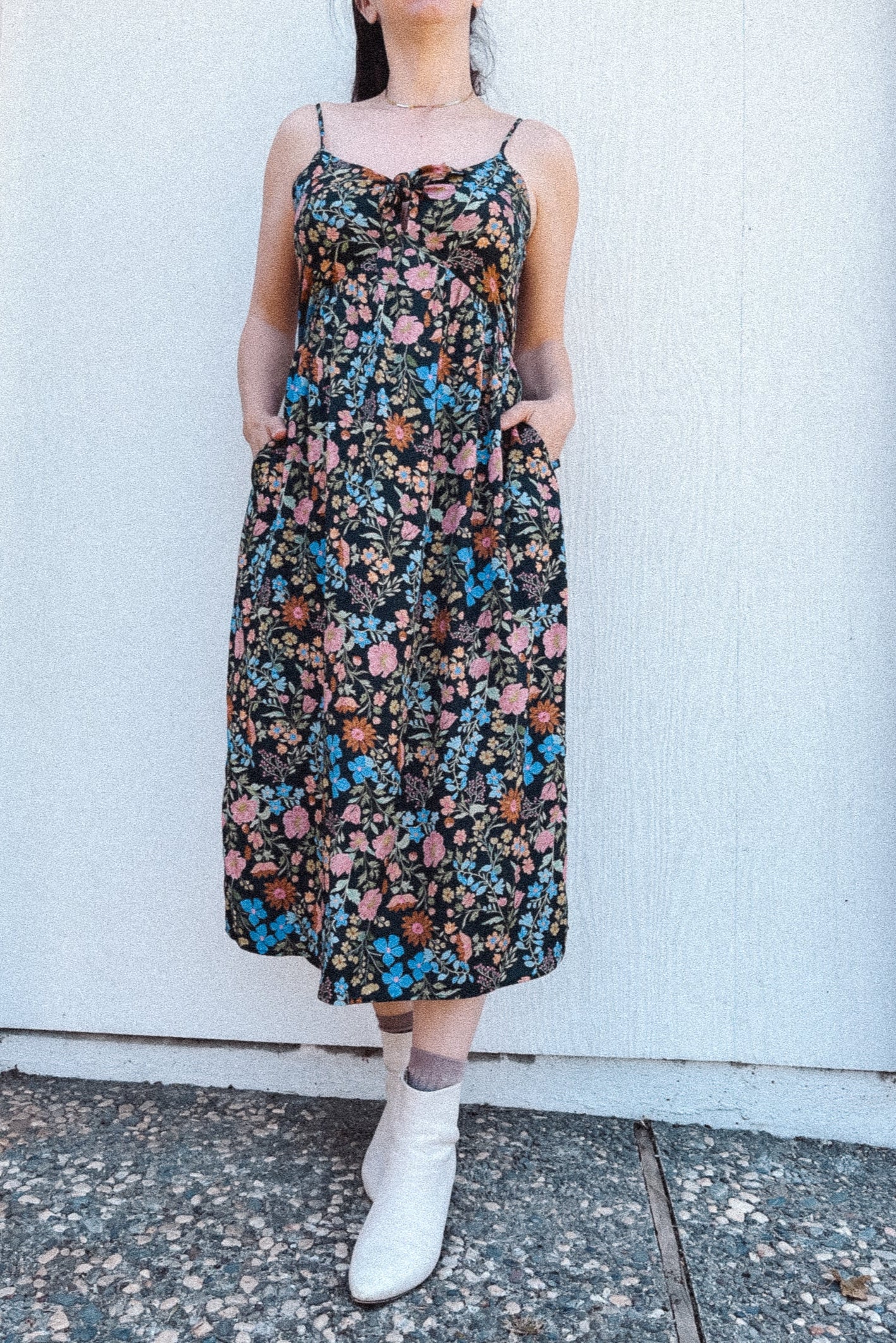 BO Tie bust Midi Dress in Multi Garden Floral - spaghetti straps, pockets and side slits