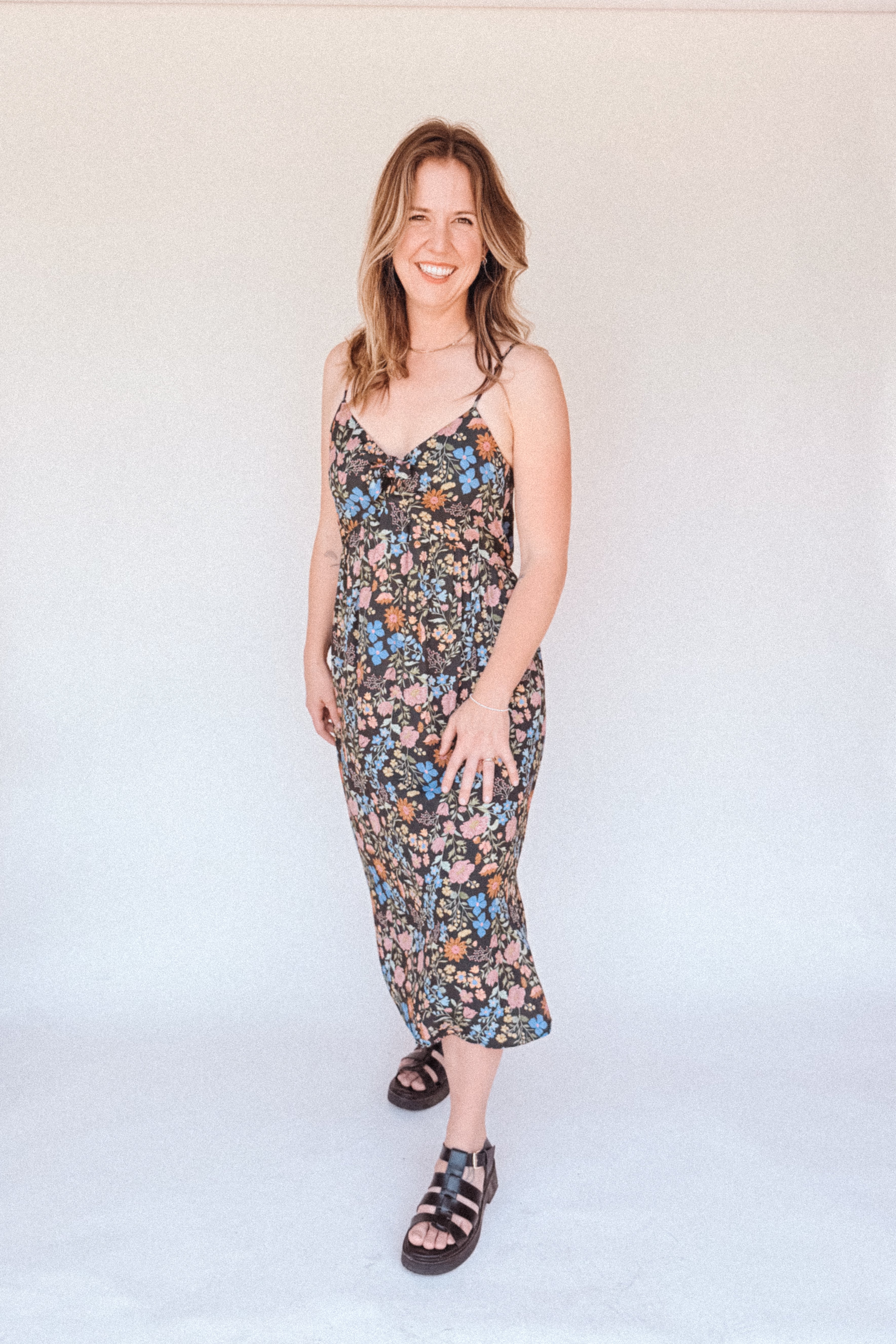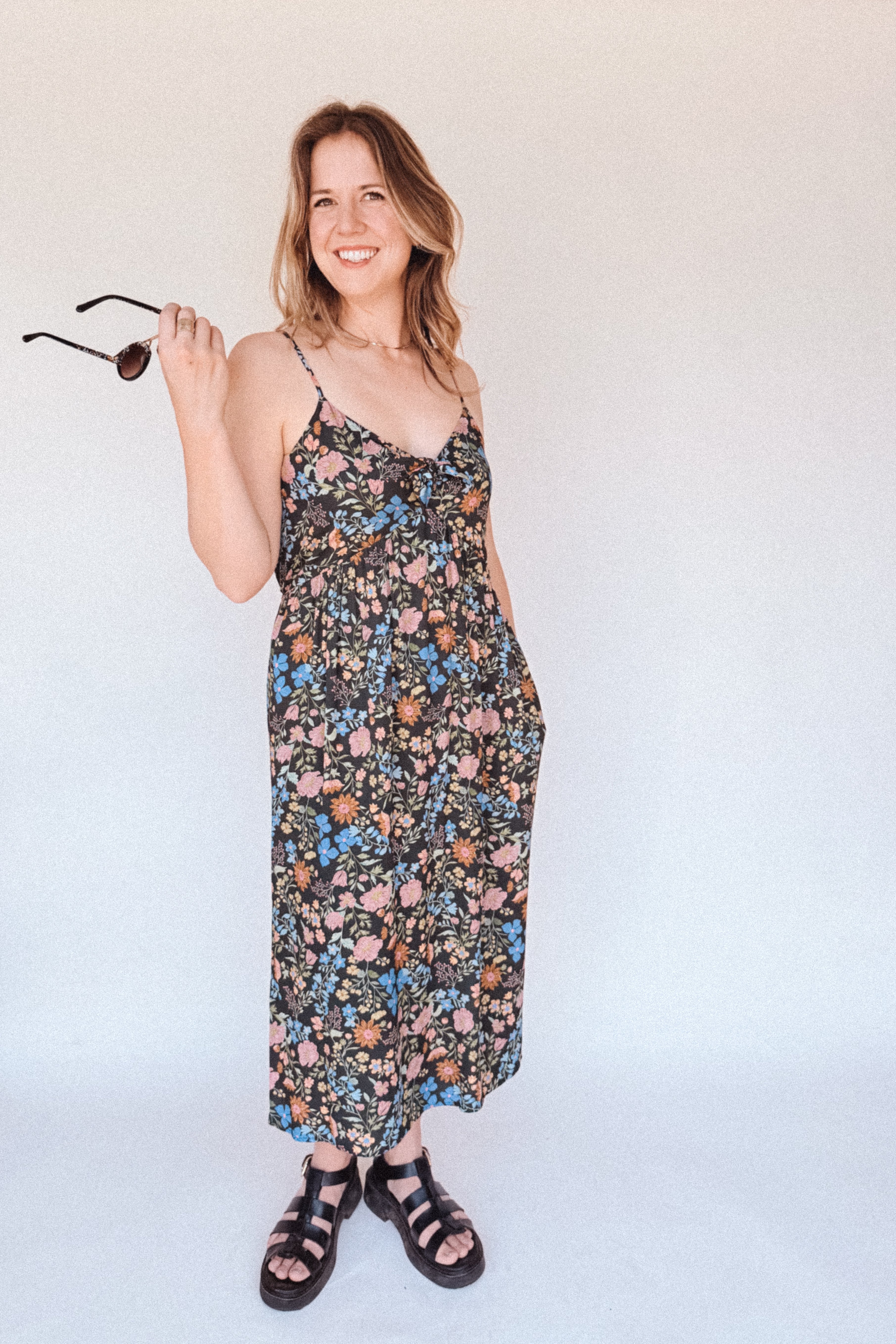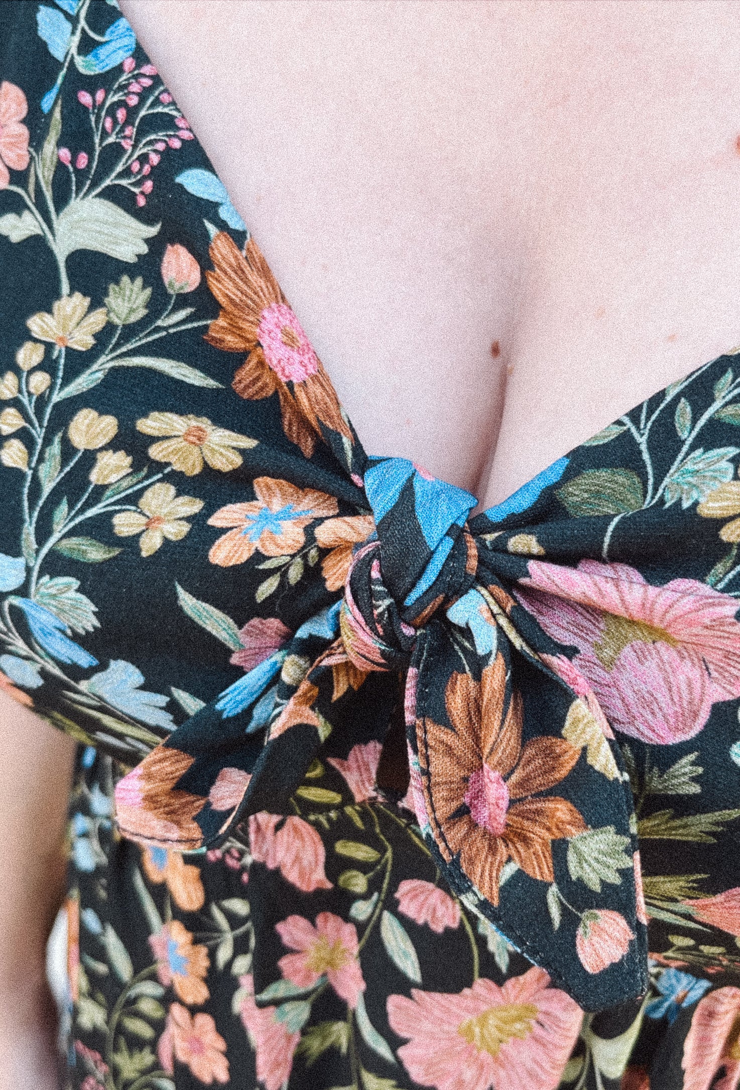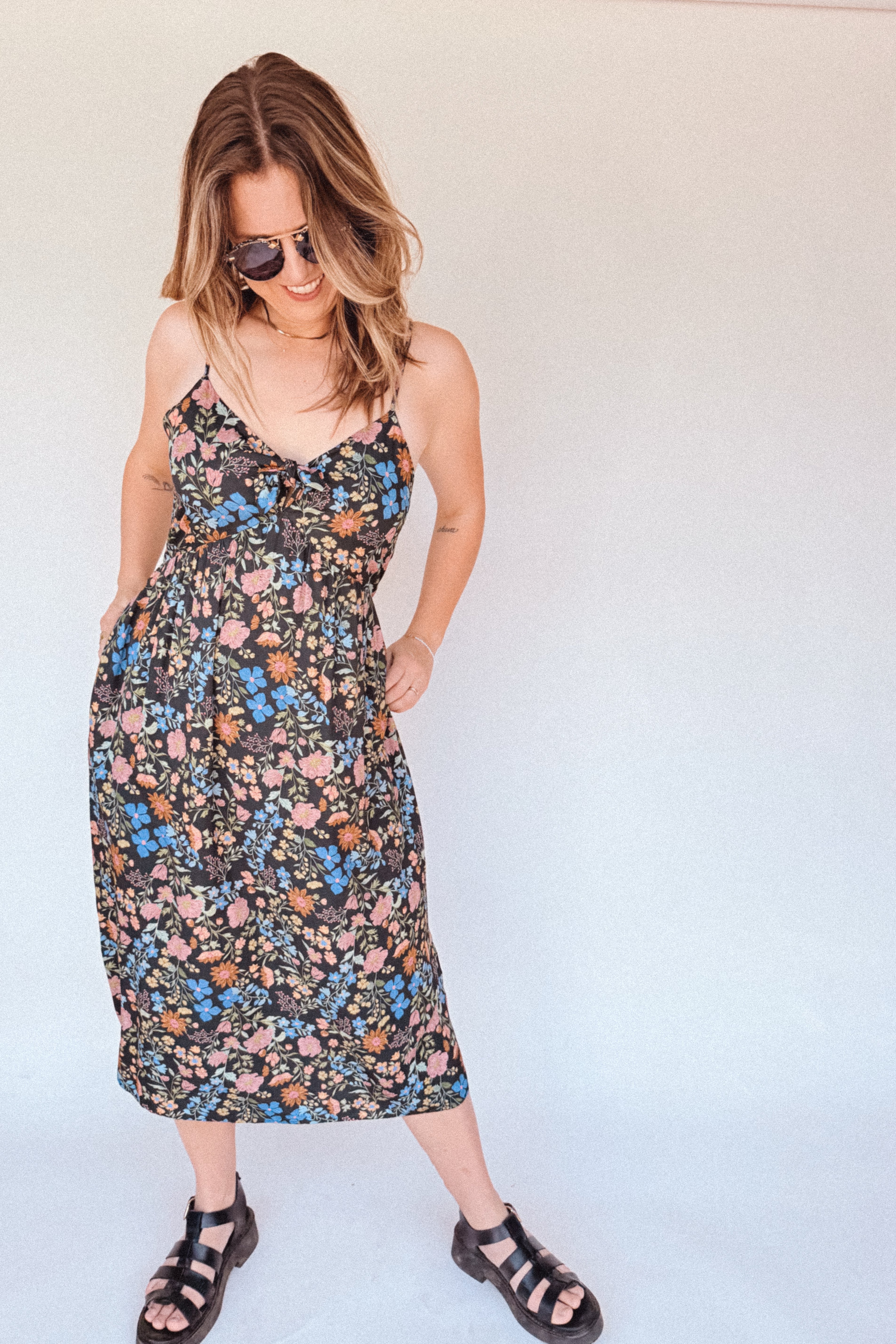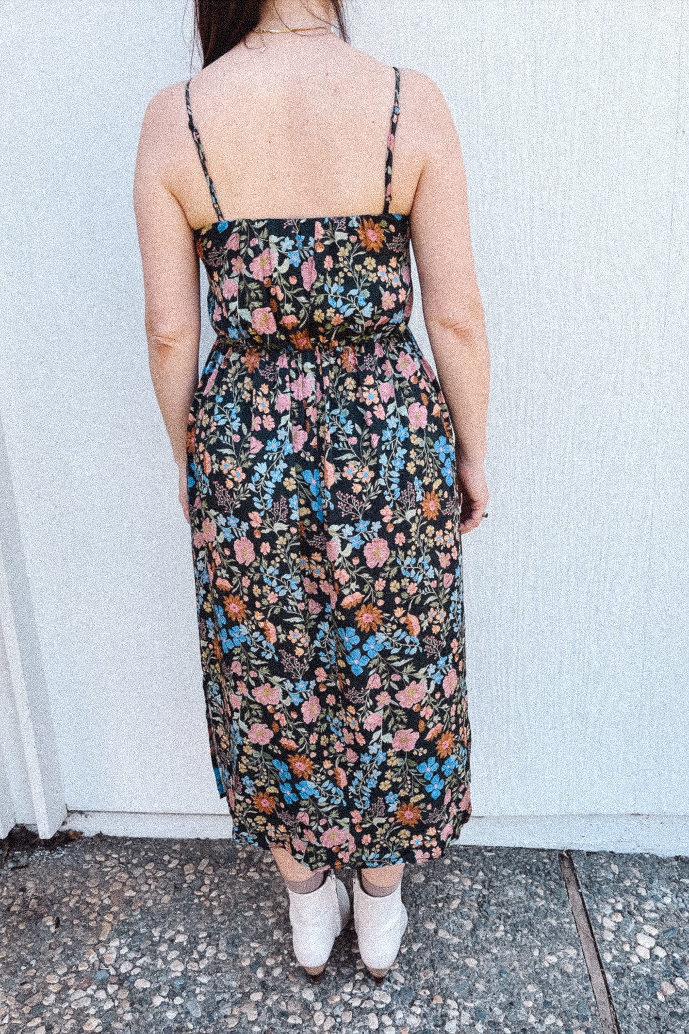 BO Tie bust Midi Dress in Multi Garden Floral - spaghetti straps, pockets and side slits