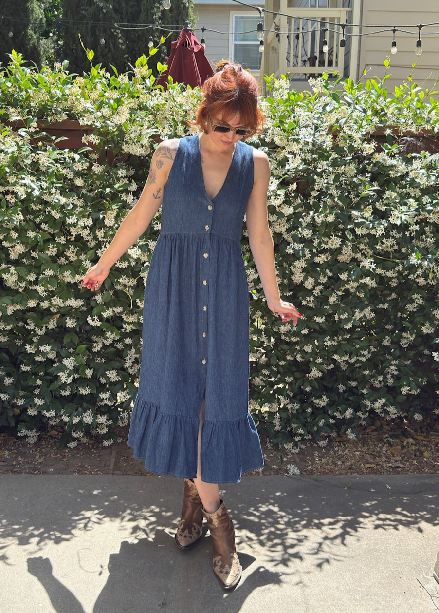 Leah Blue Denim button- up,V-neck Midi Dress with hem ruffle – Sleeveless, Button-Up