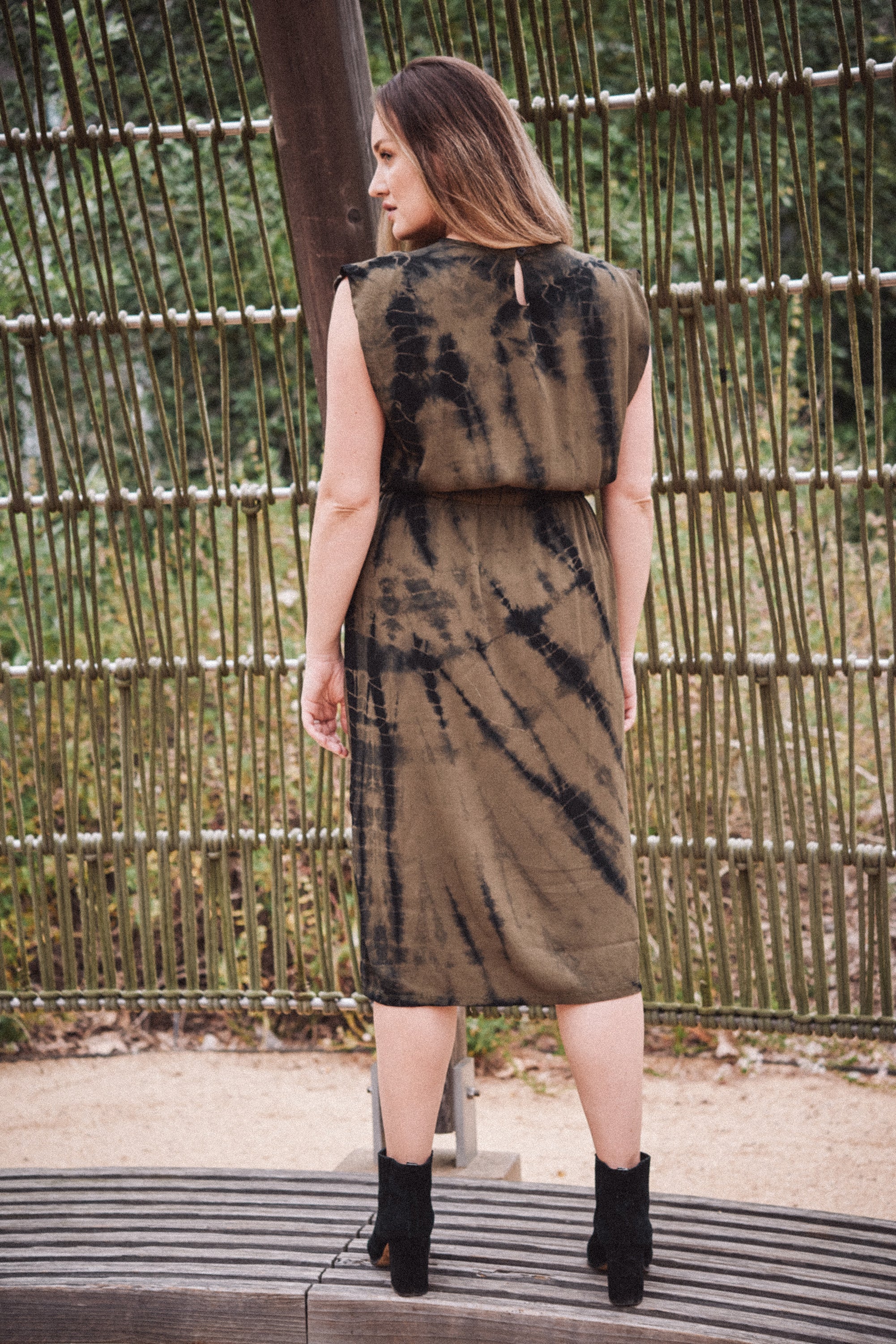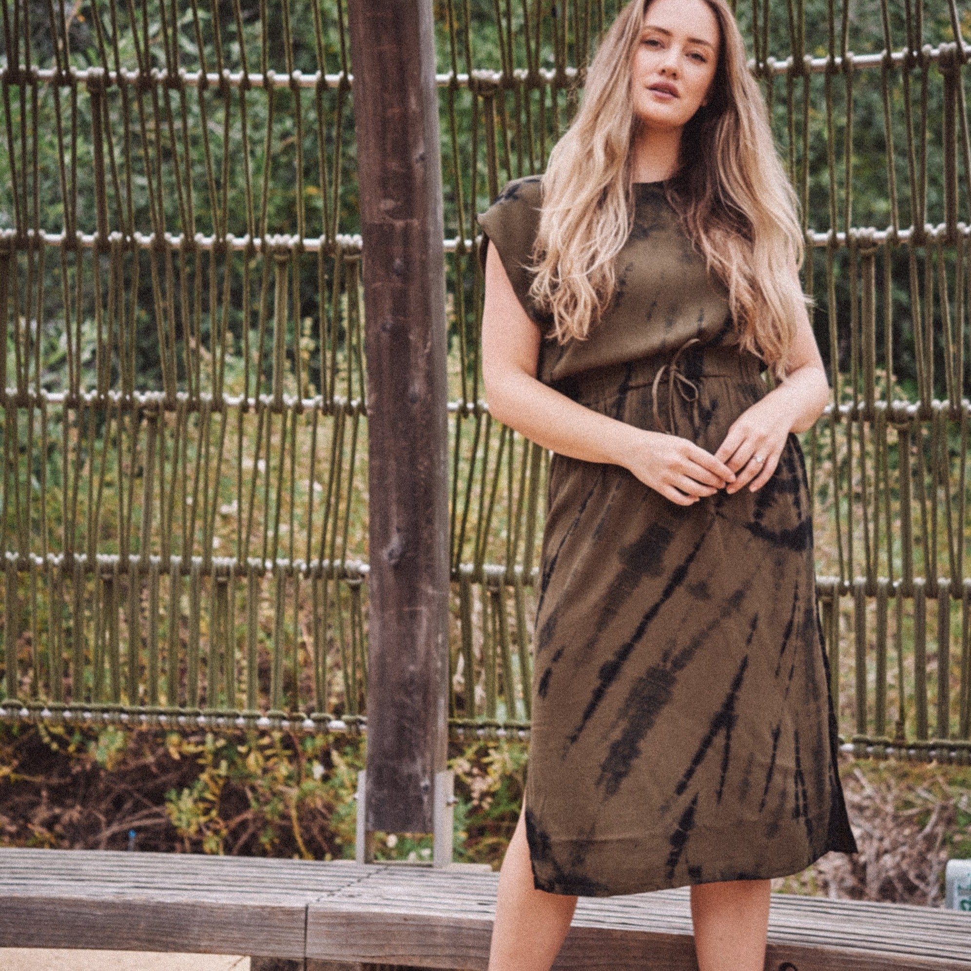 TAYLOR Drawstring Midi Dress in Olive Tie Dye (Woven)