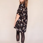 Deadstock rayon Challis with soft drape, blurred floral print on black ground