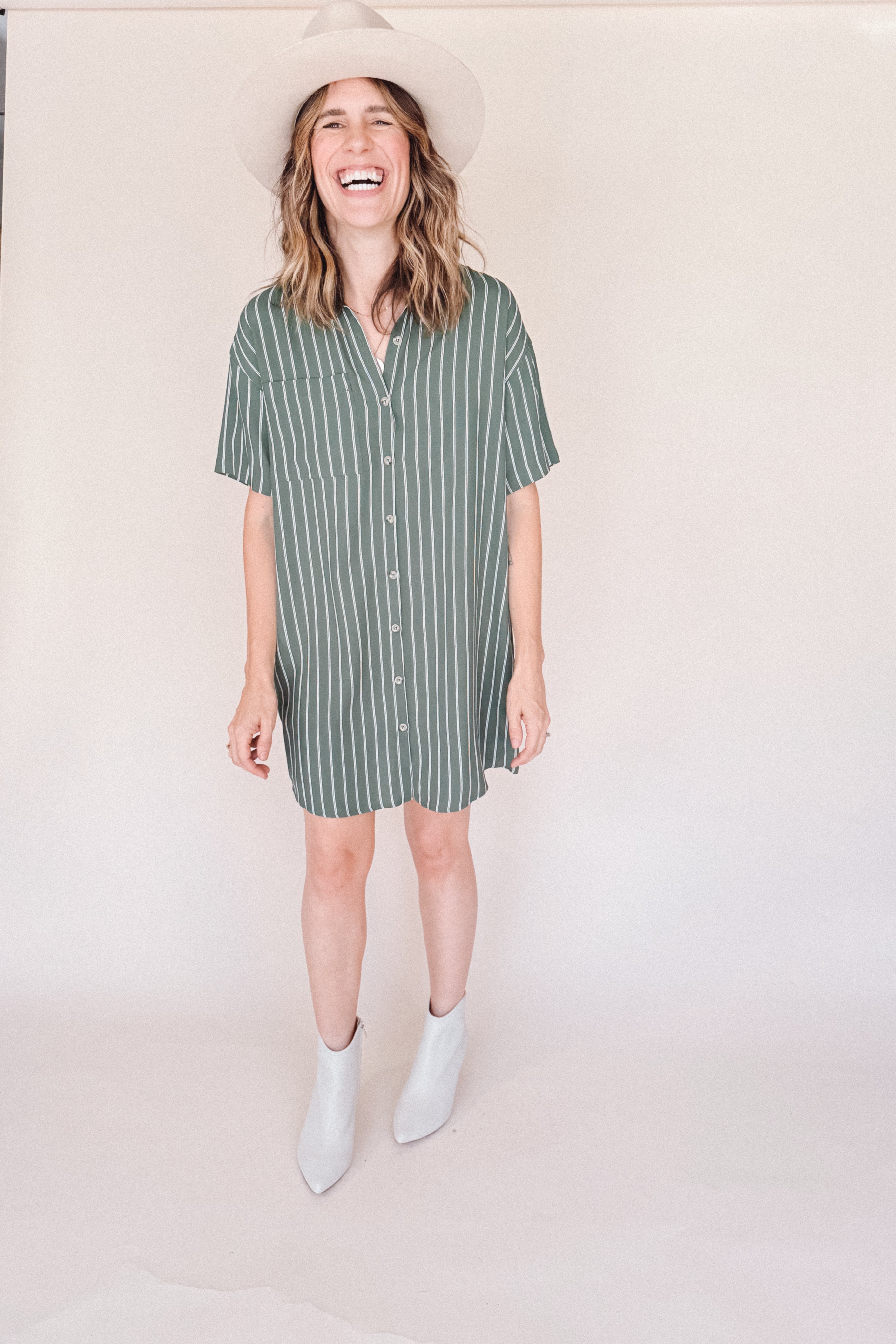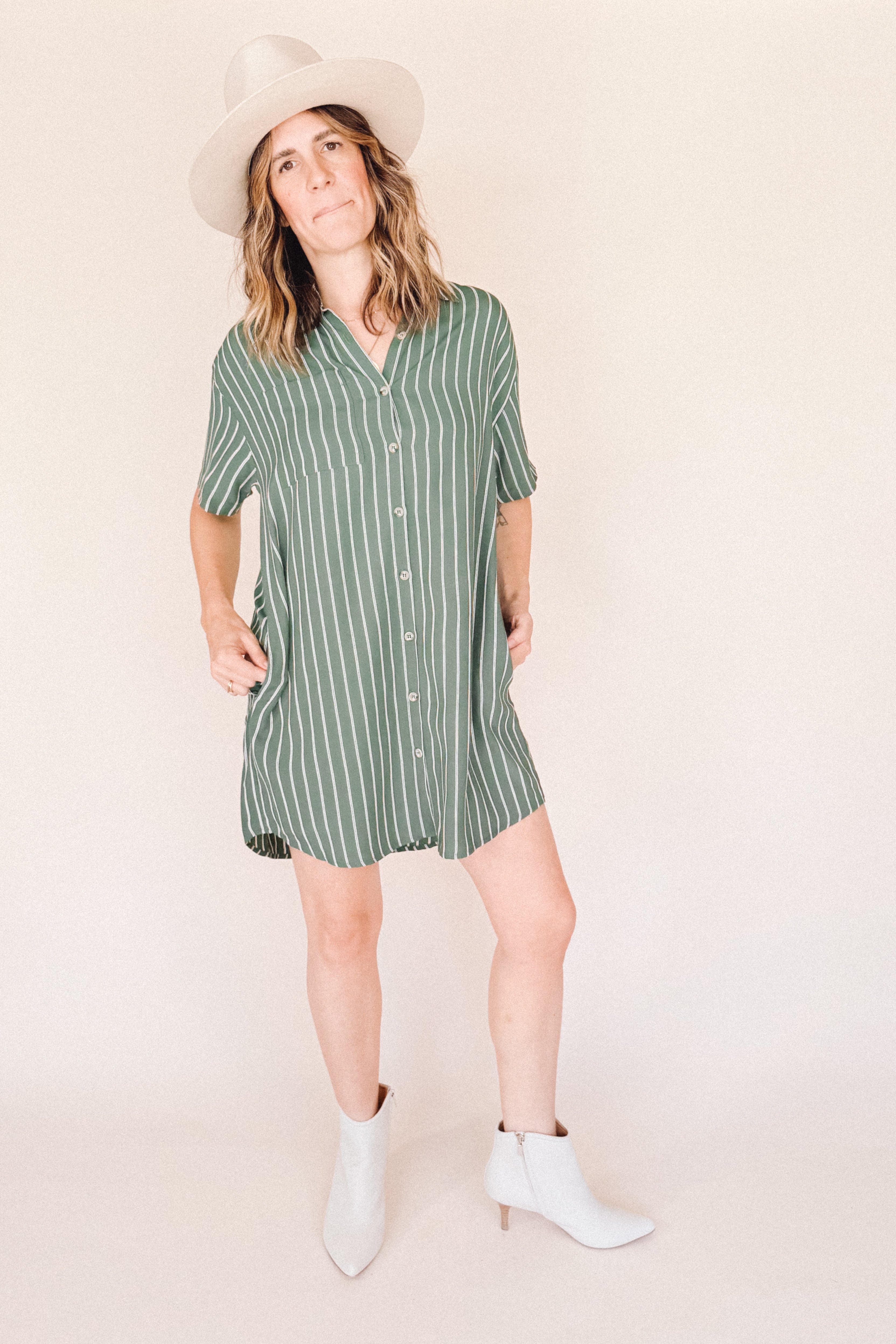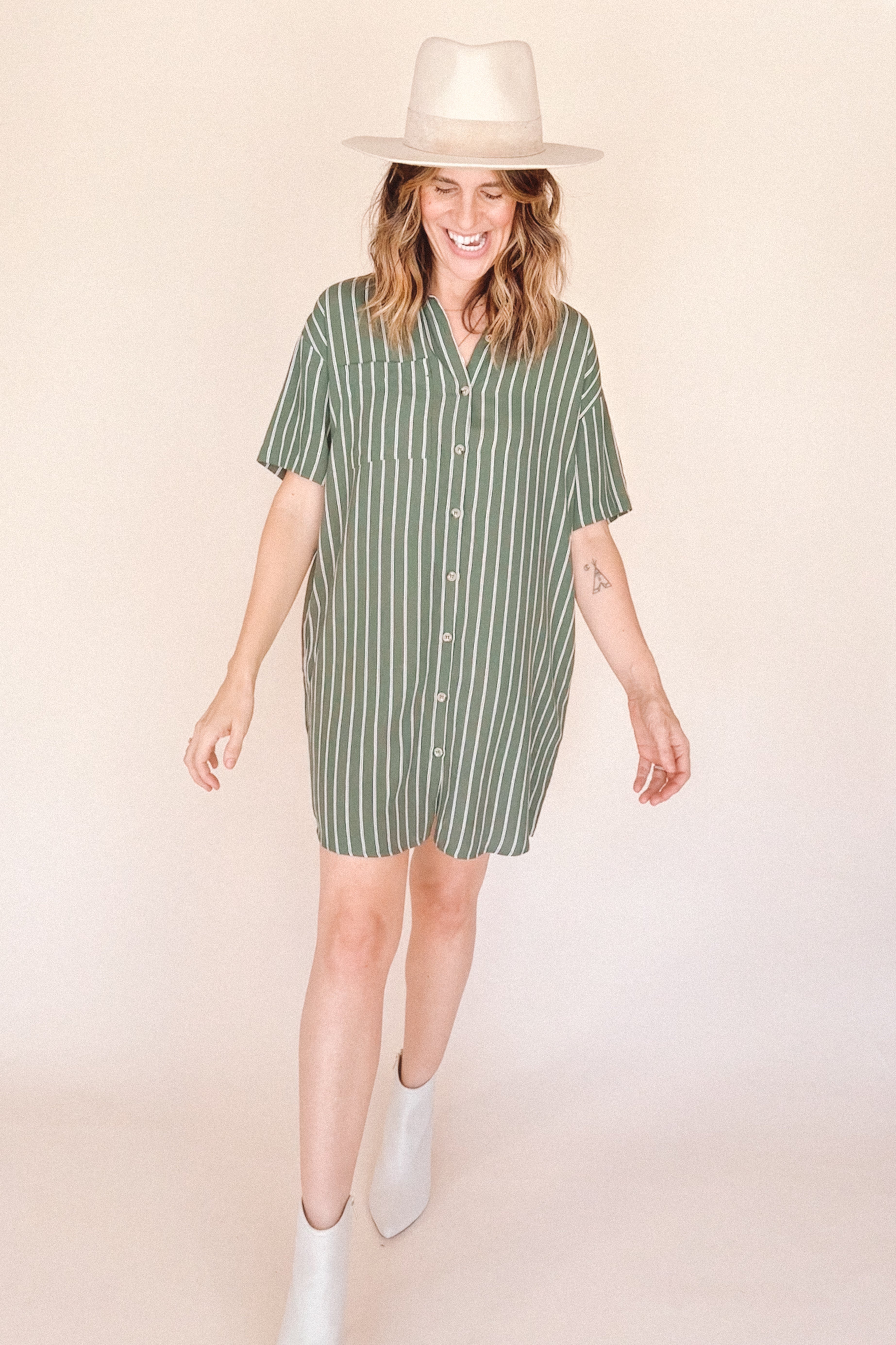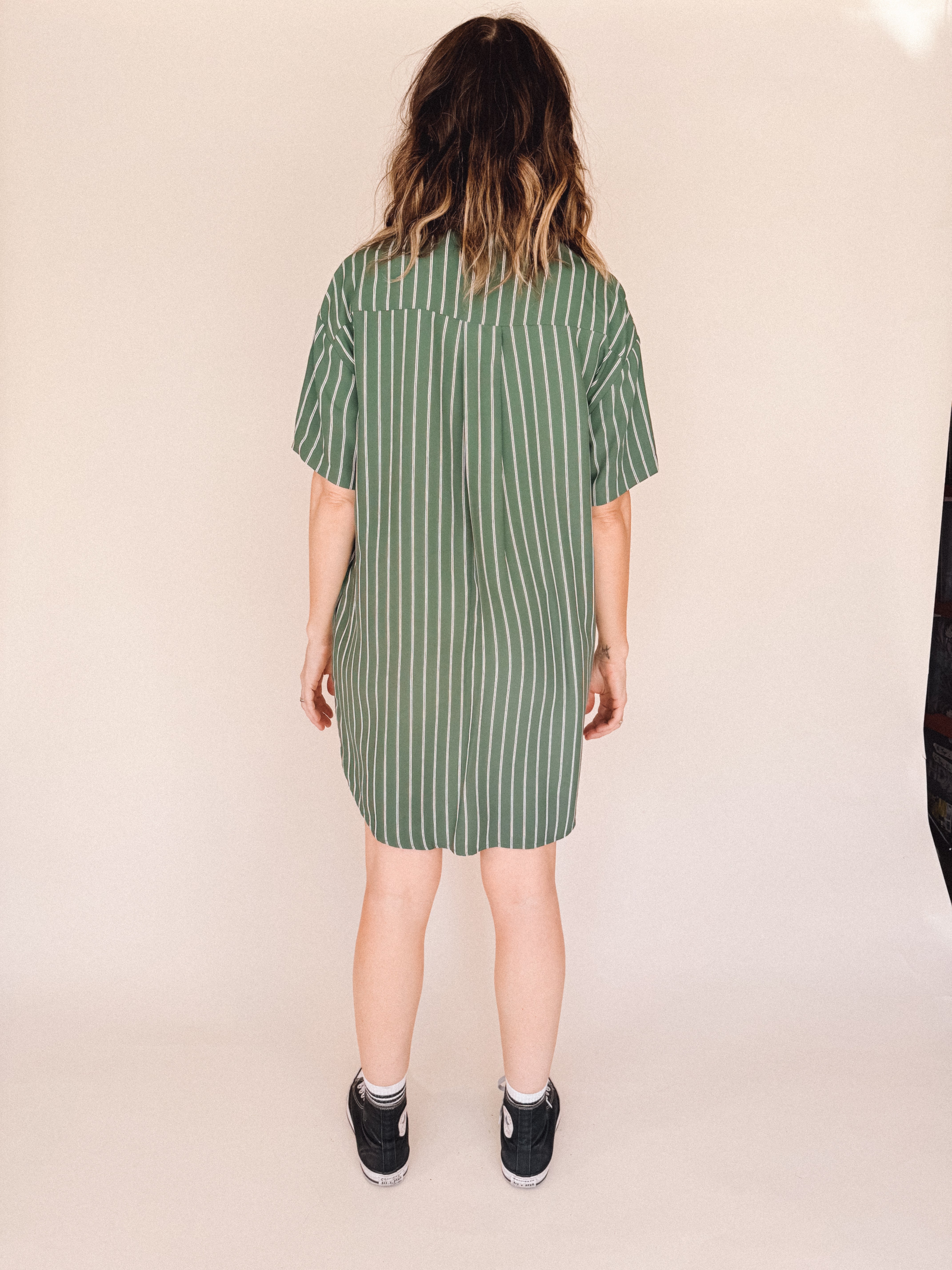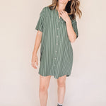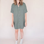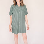 AVERY-Short Sleeve Button-Up Mini Shirt Dress Green stripe– Collared, Back Pleat & Pockets (Wear Two Ways)