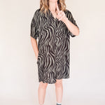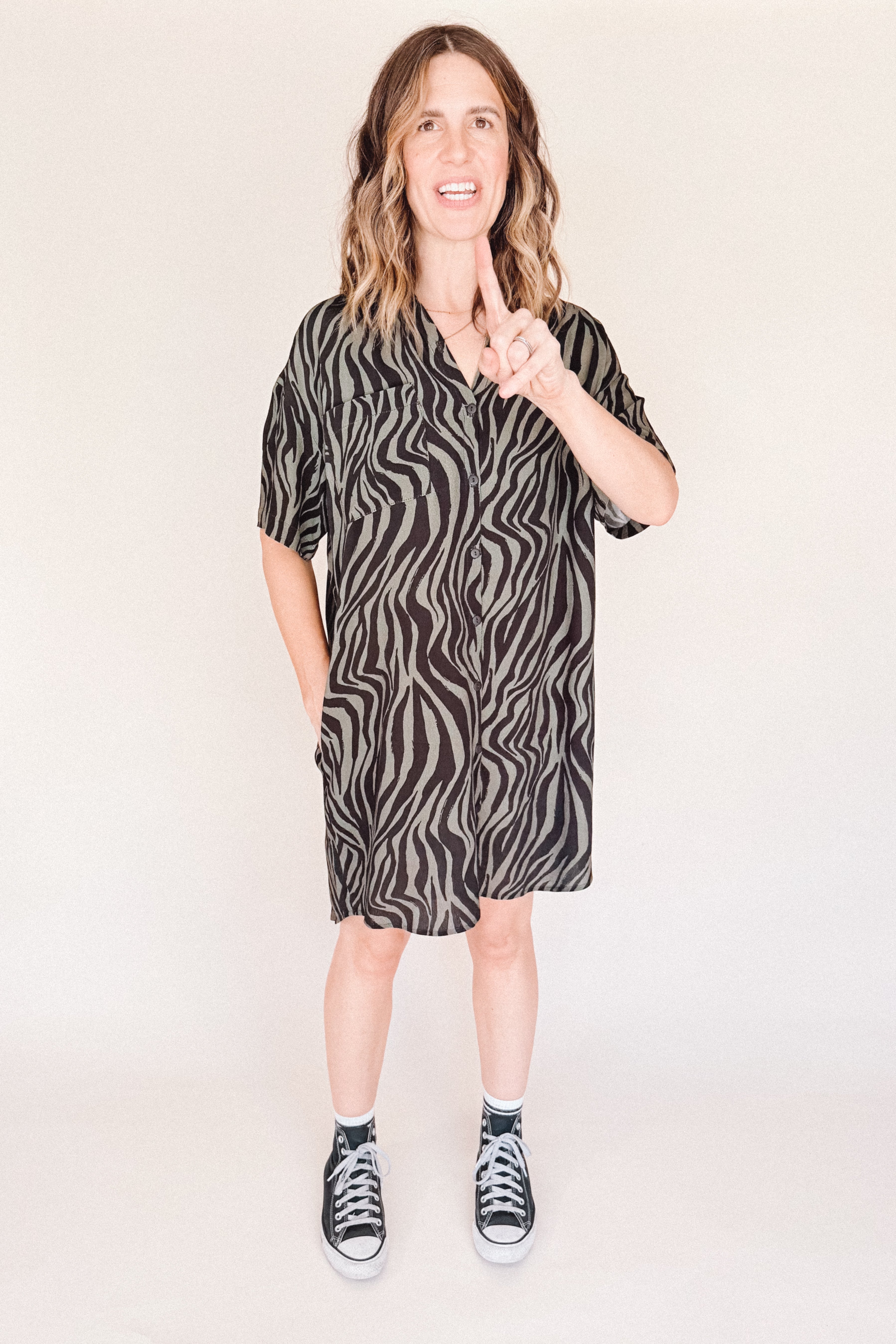 AVERY-olive ZEBRA print Short Sleeve Button-Up Mini Shirt Dress – Collared with Pockets (Wear Two Ways)
