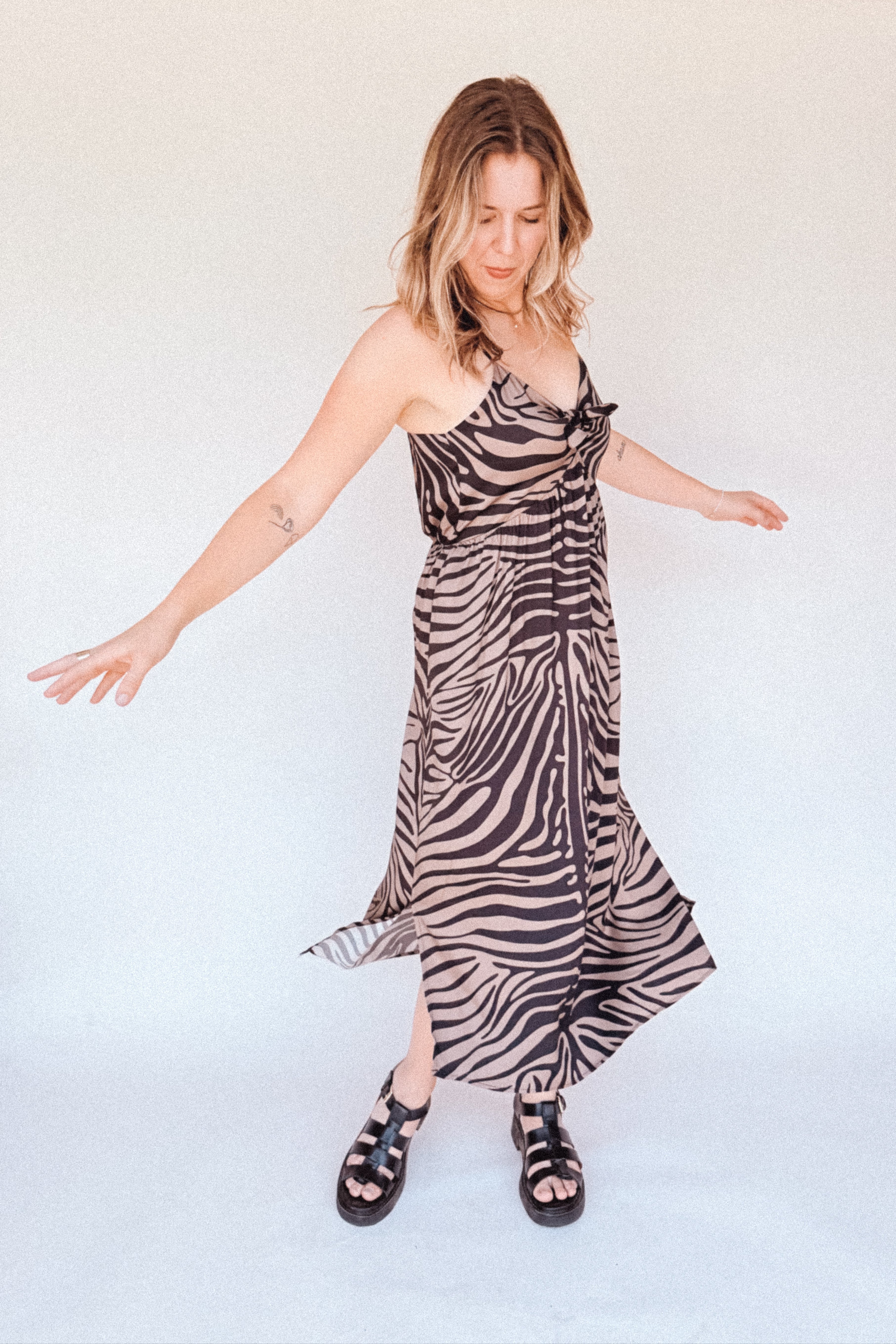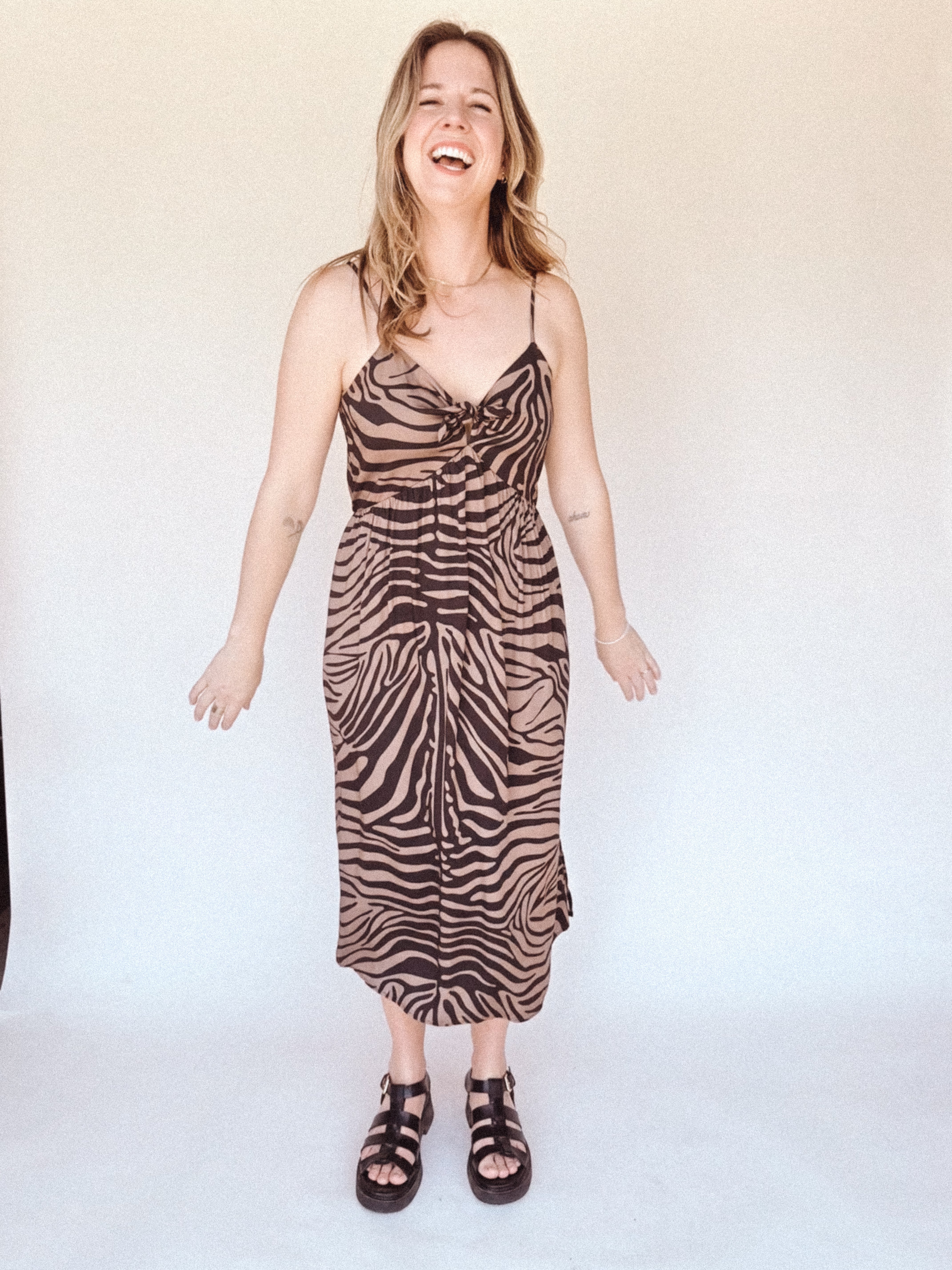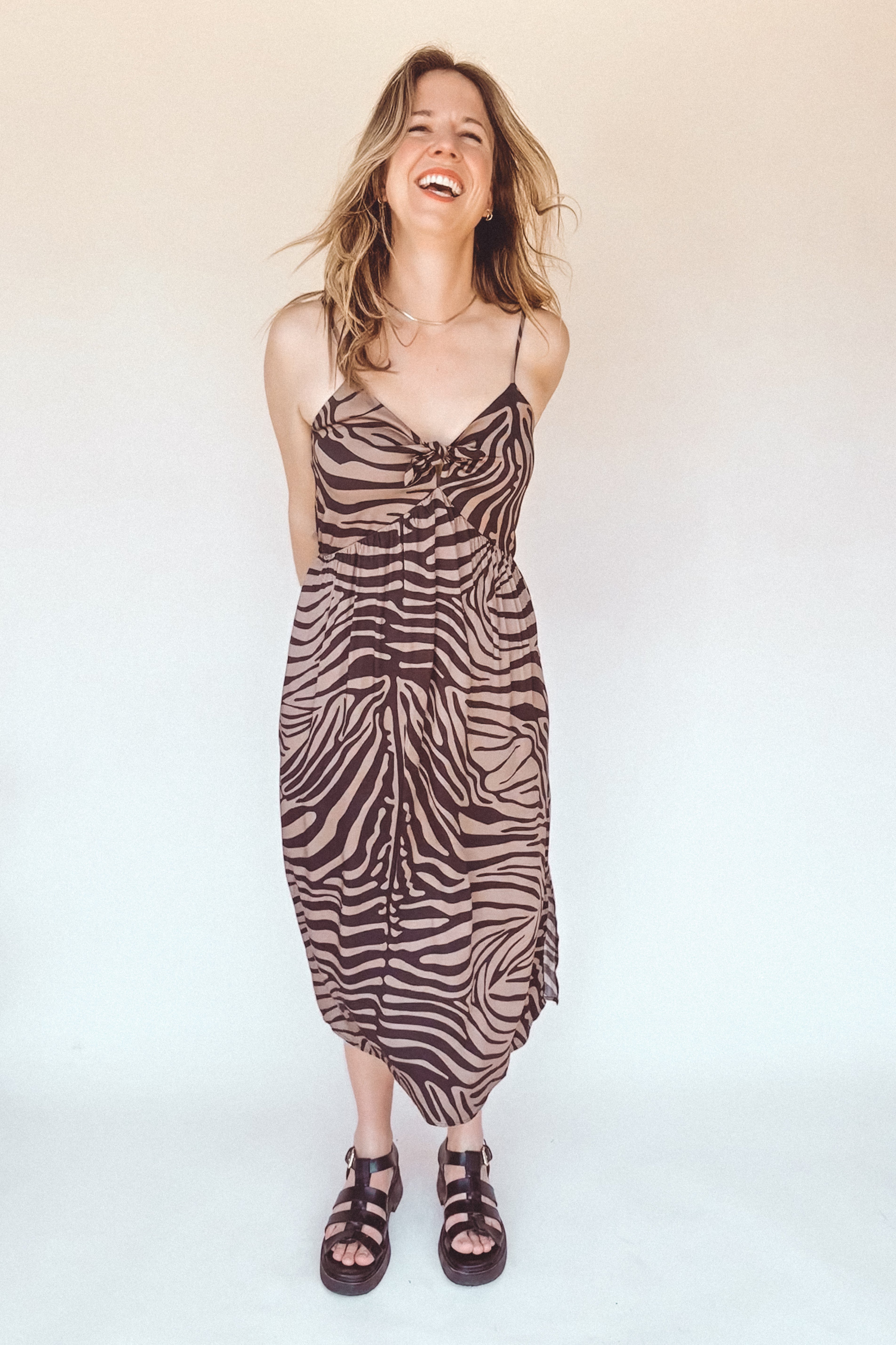 BO Tie bust Midi Dress in black brown zebra stripe - spaghetti straps, pockets and side slits