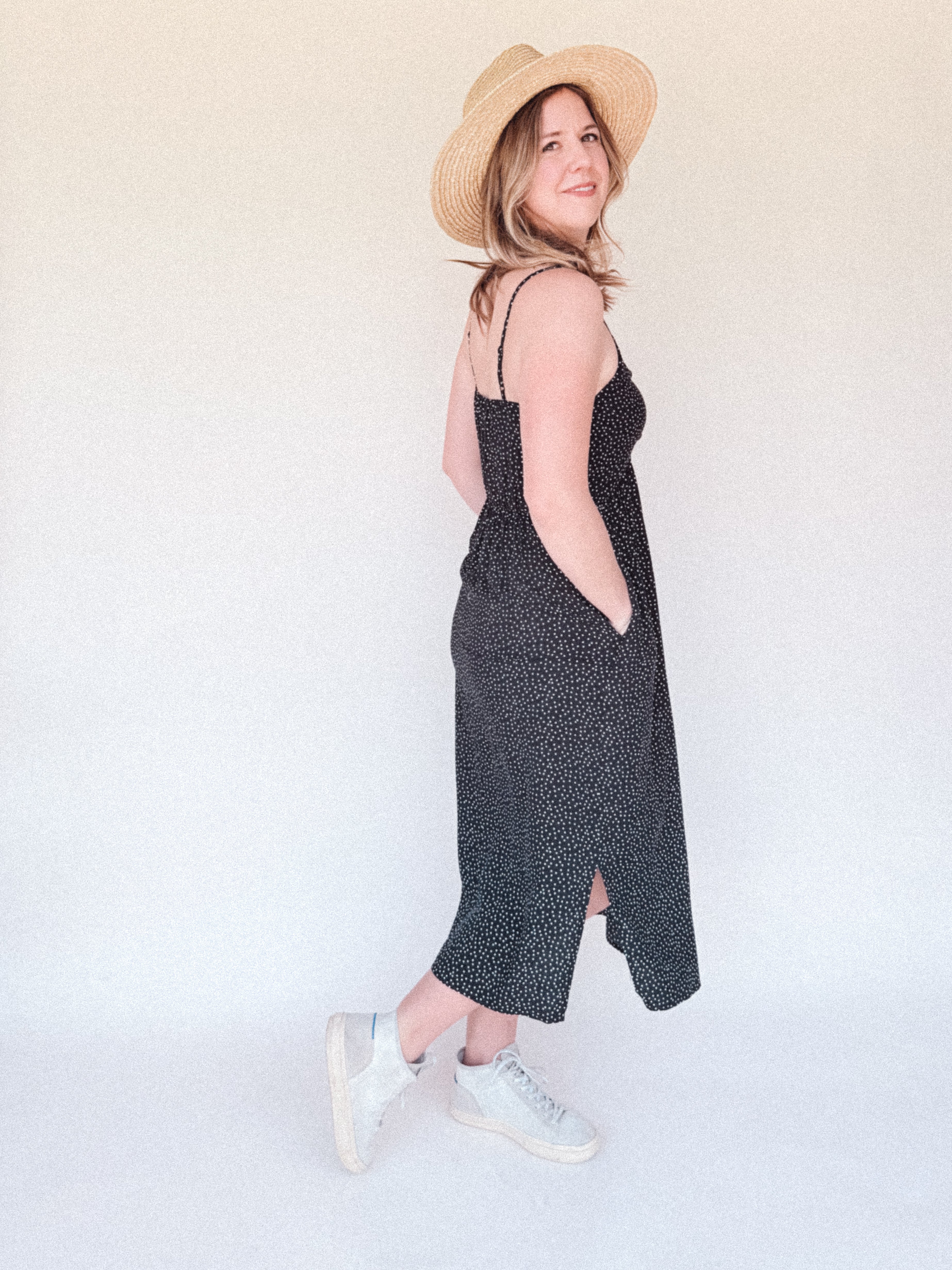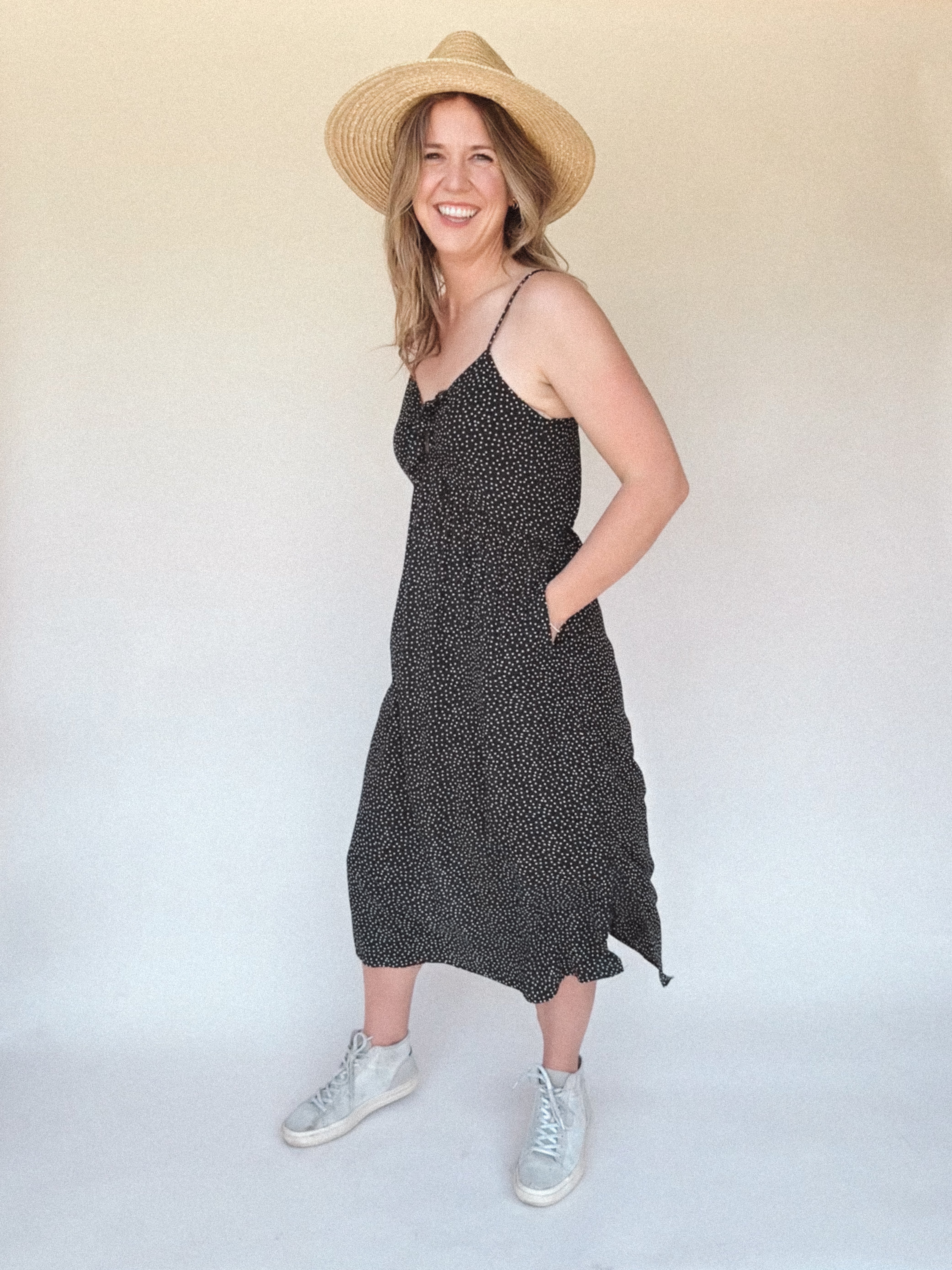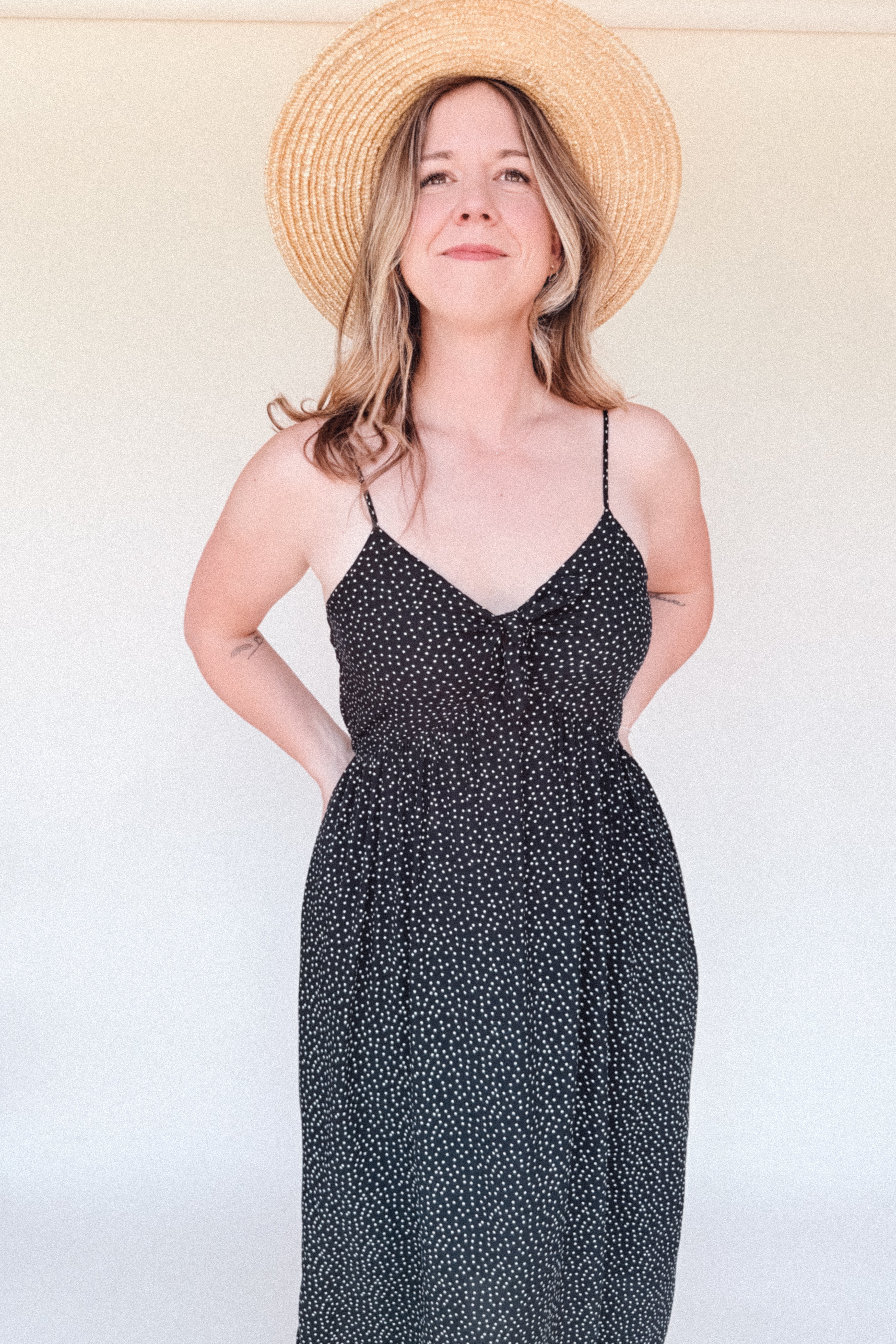 BO Tie bust Midi Dress in black white polka dot - spaghetti straps, pockets and side slits