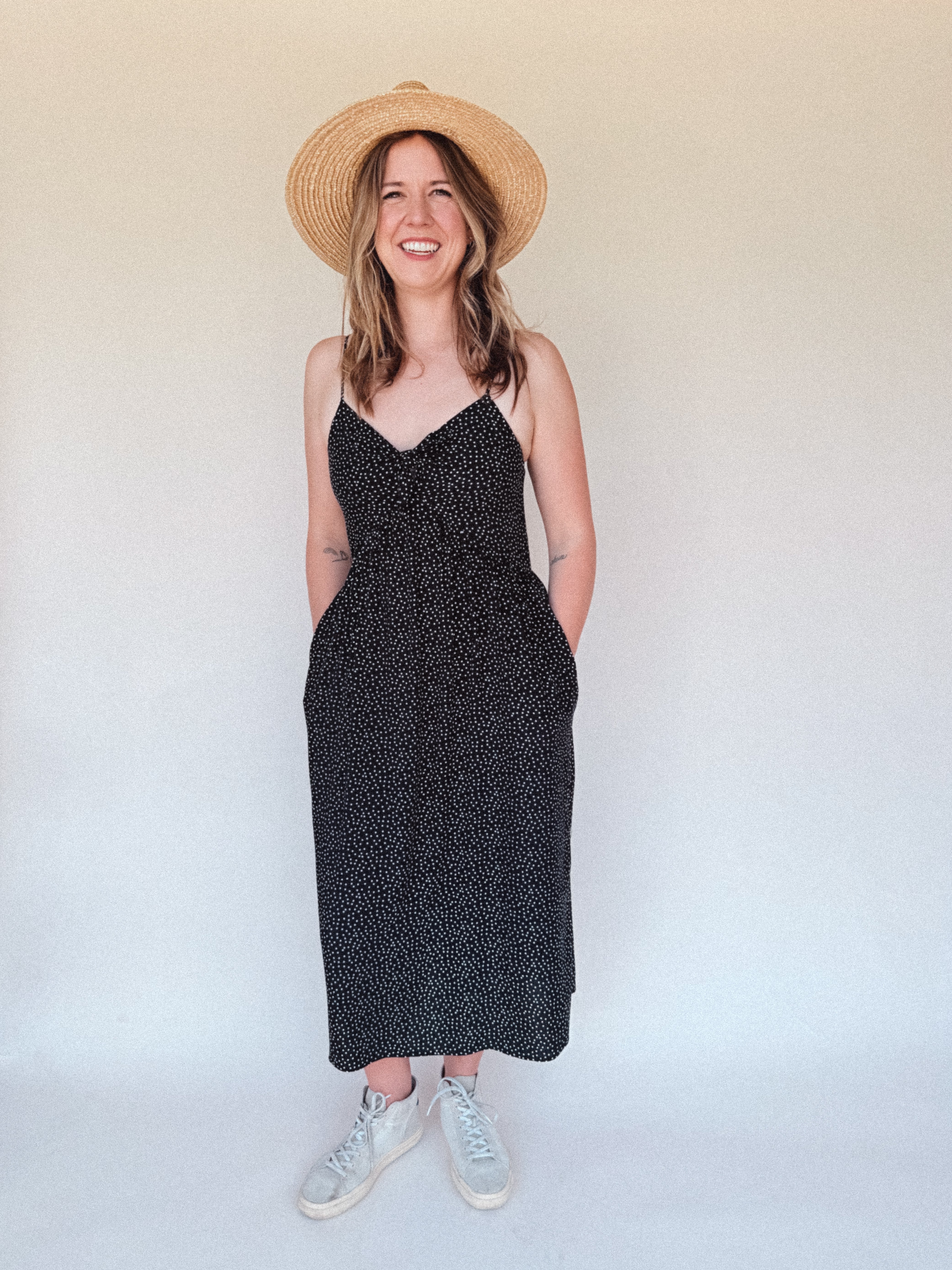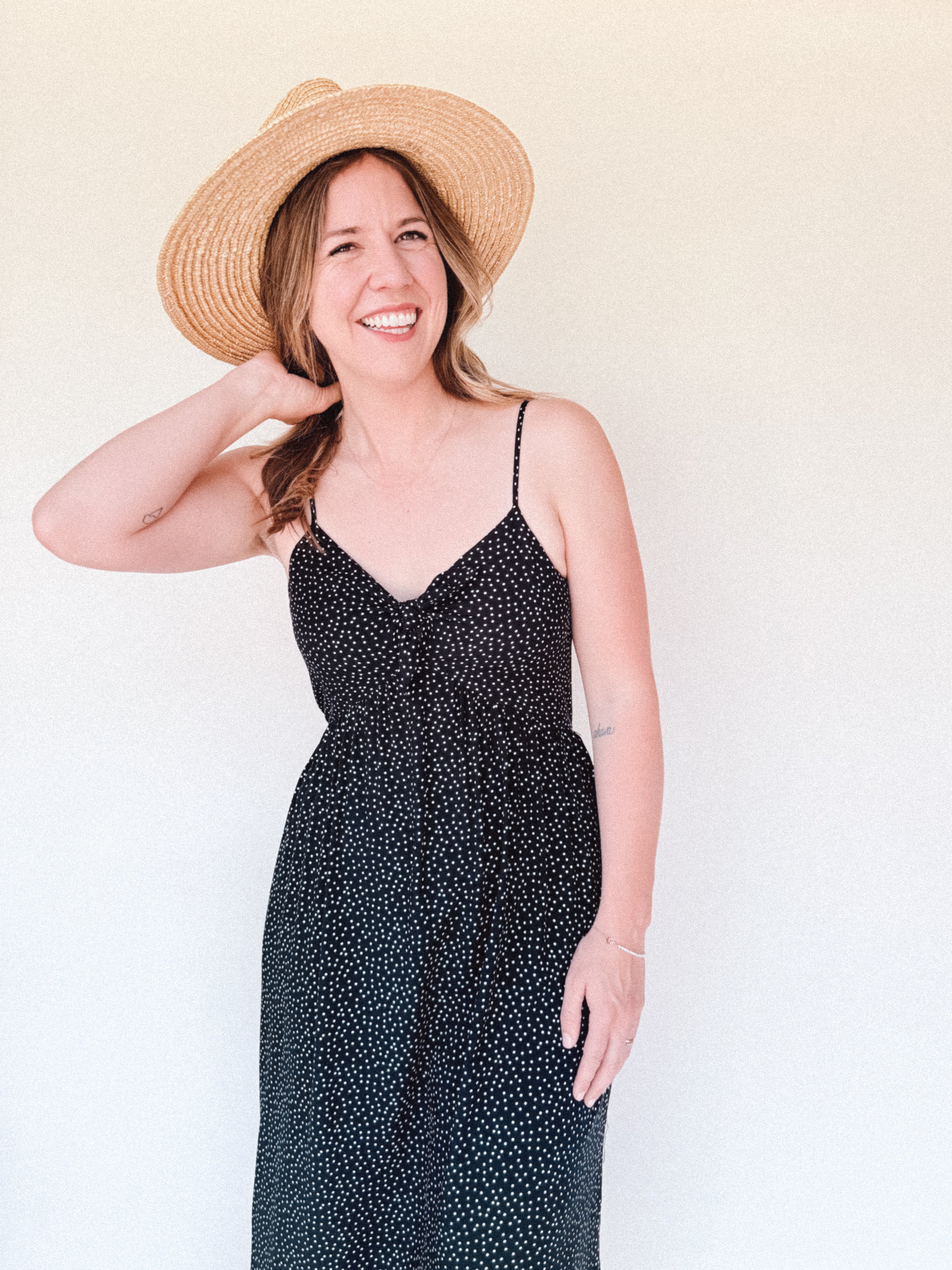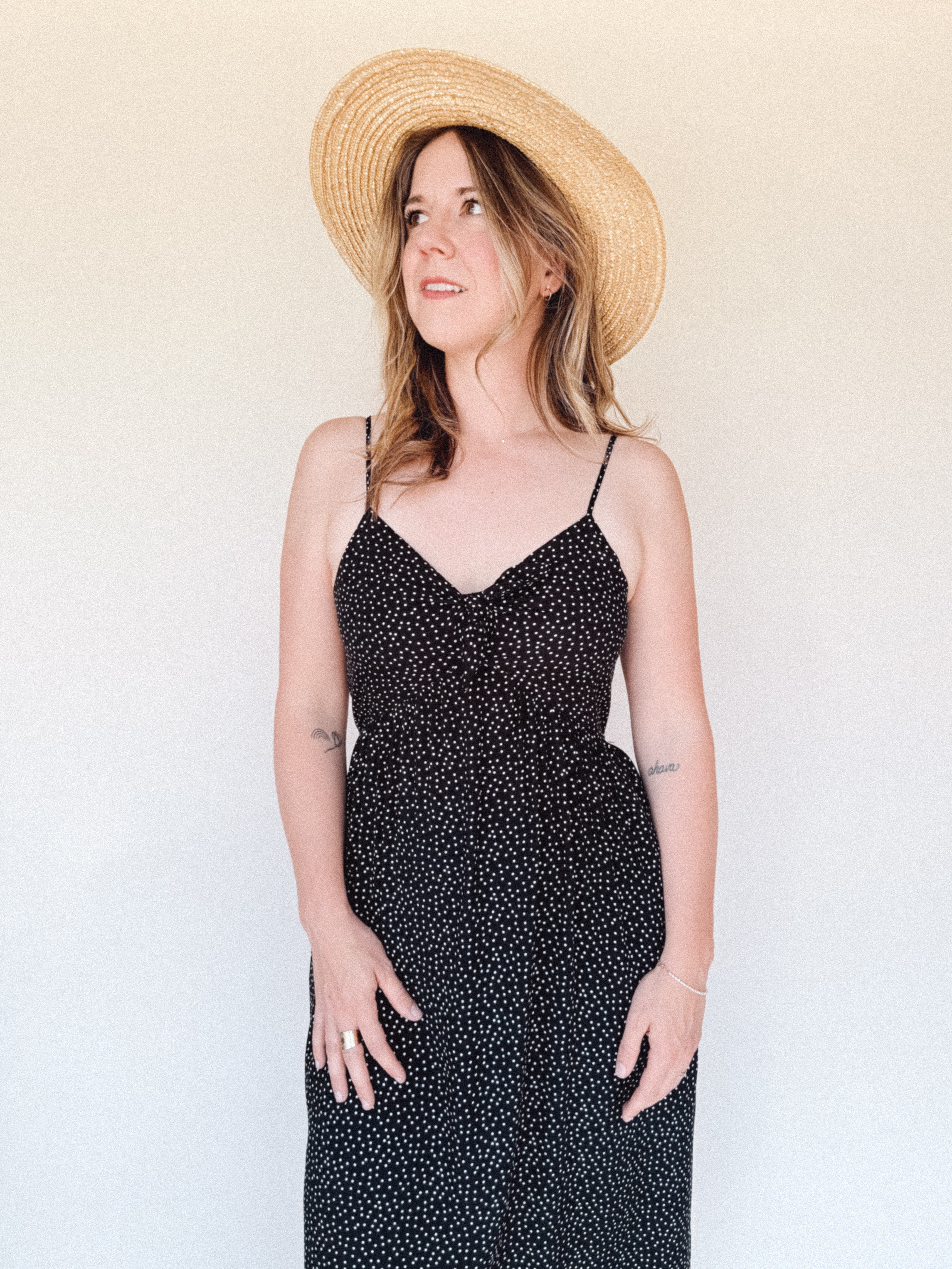 BO Tie bust Midi Dress in black white polka dot - spaghetti straps, pockets and side slits
