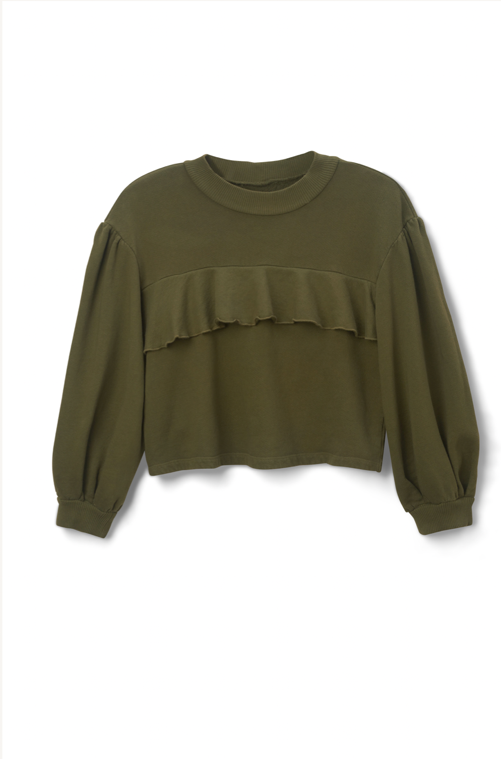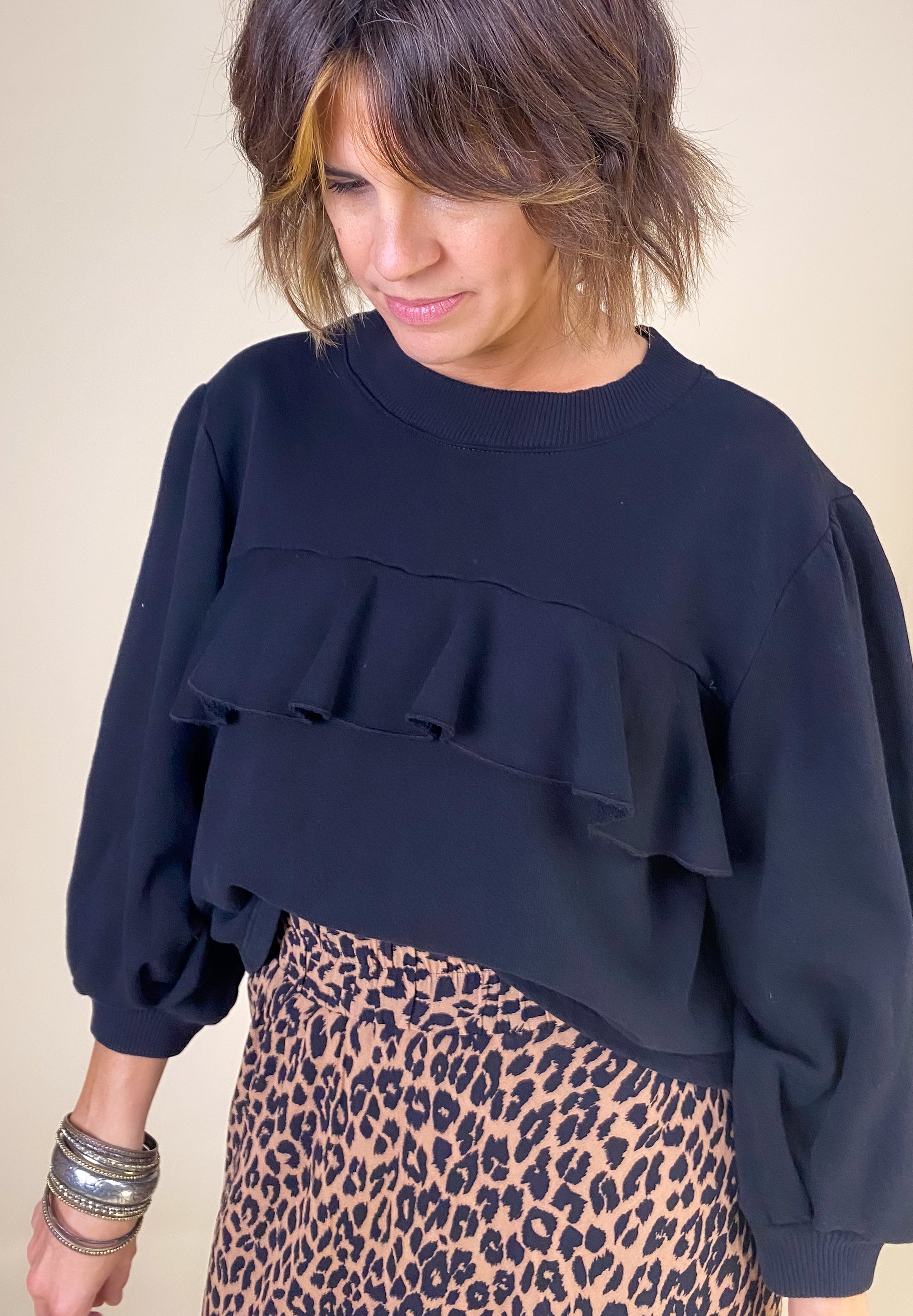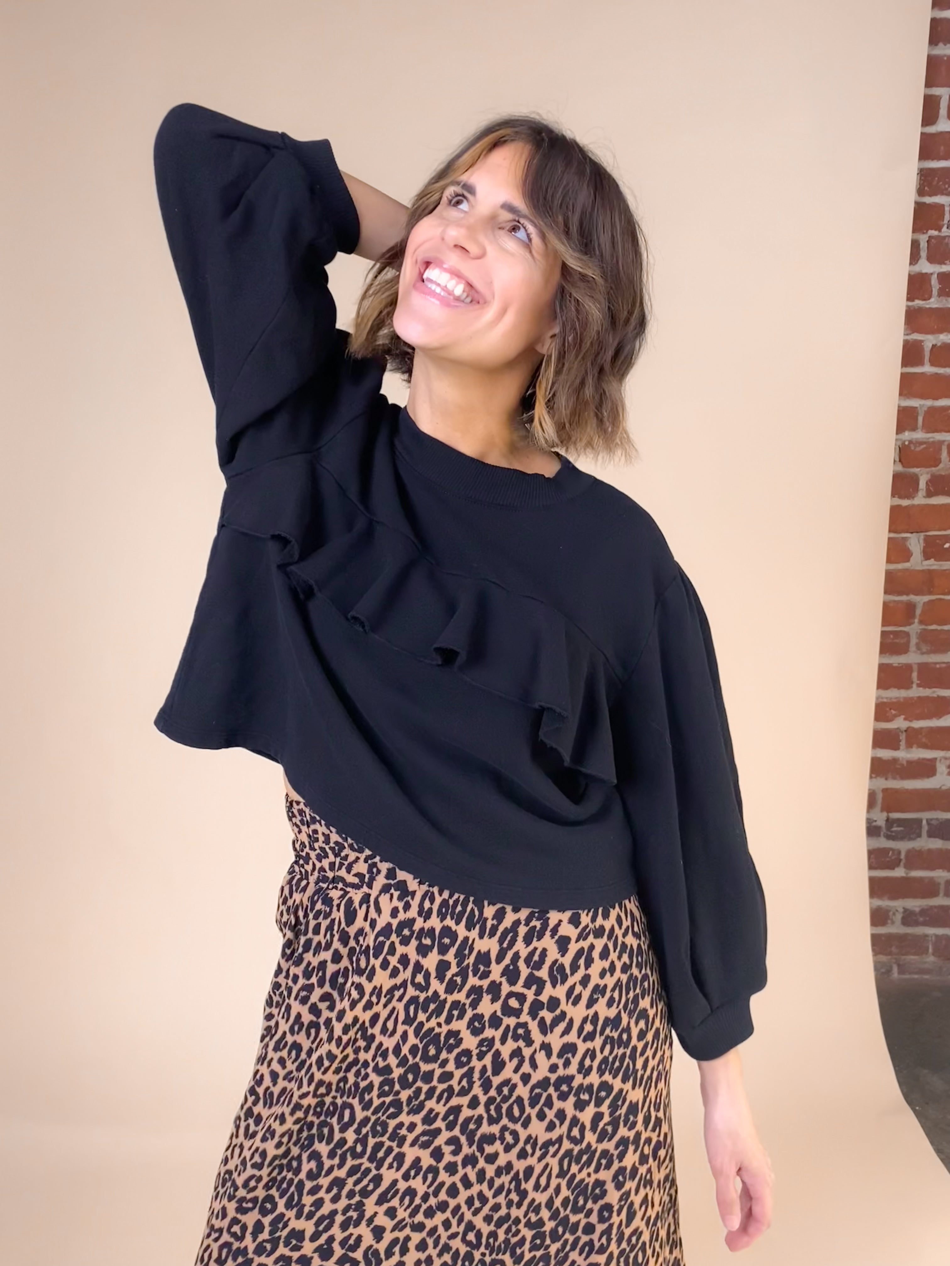 Ruffle front semi-cropped sweatshirt with slight balloon 3/4 sleeves. The not so basic basic.