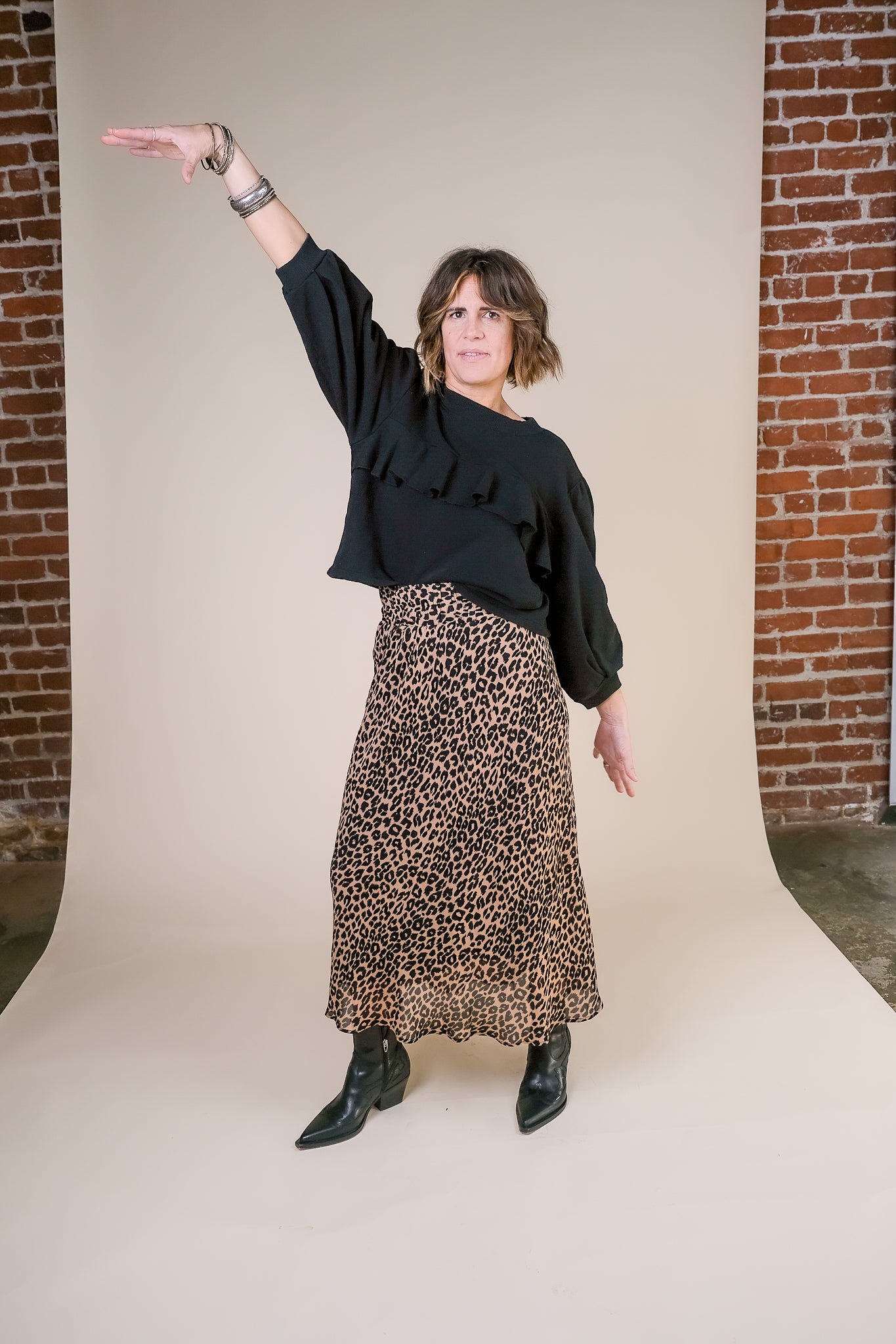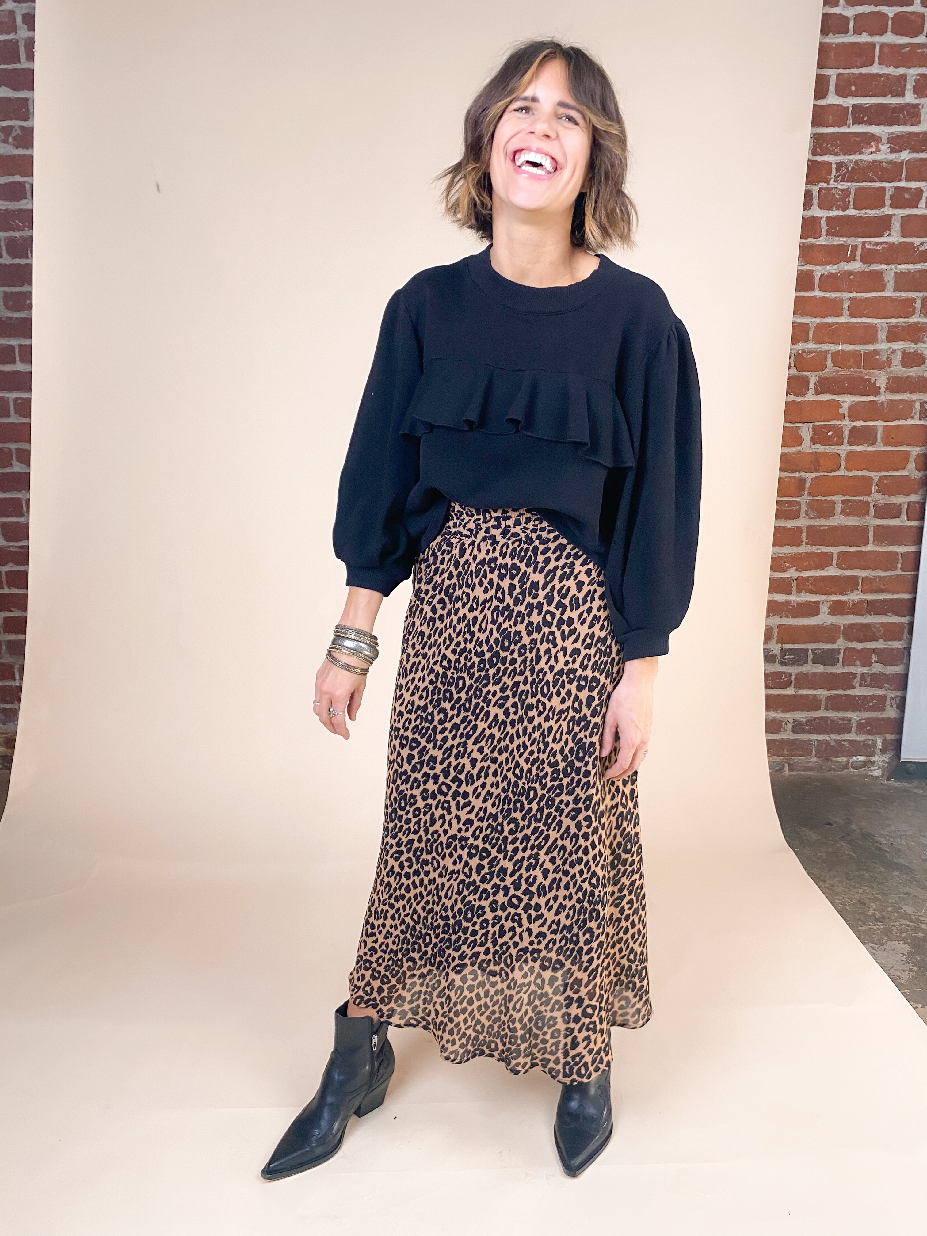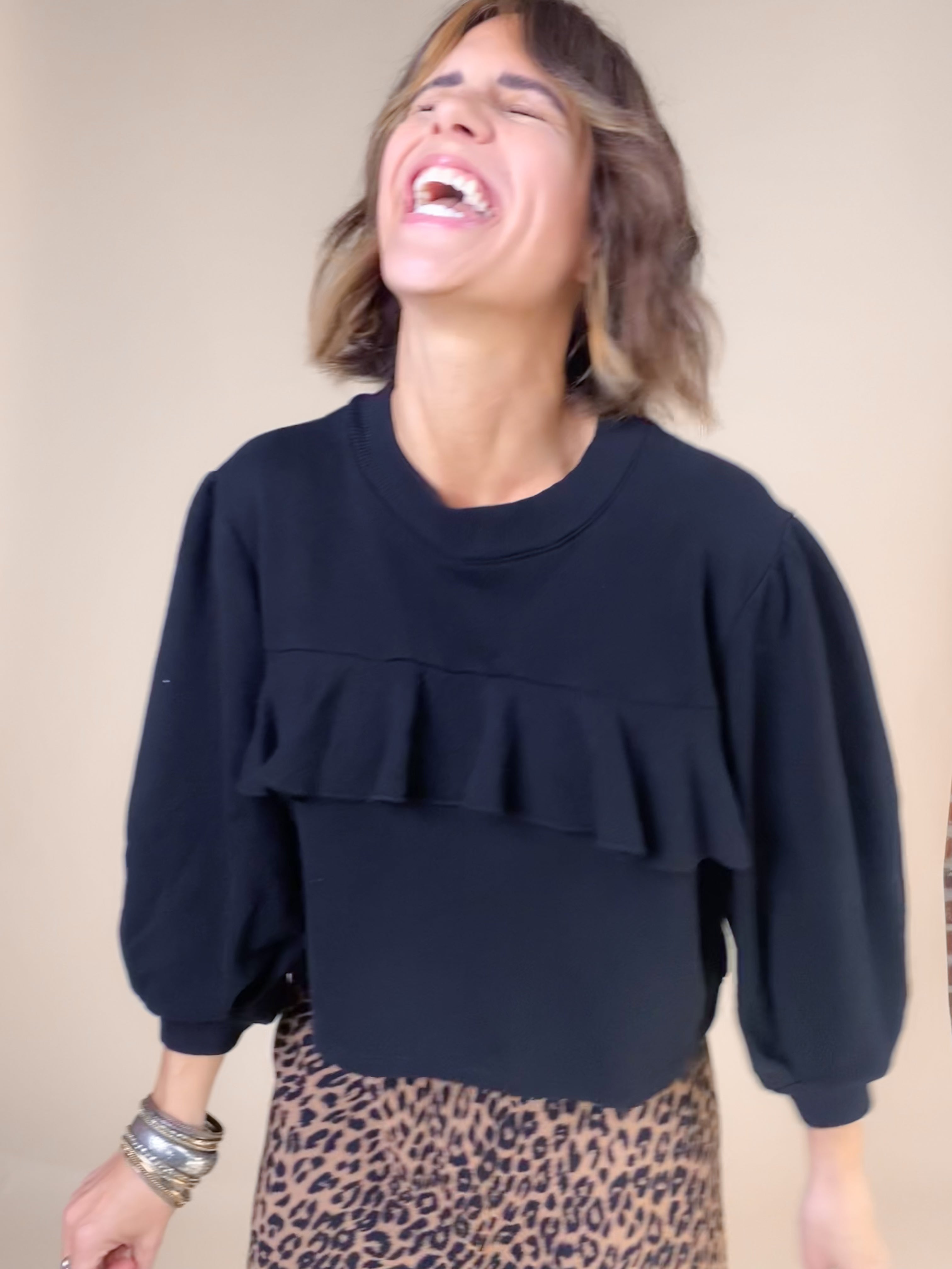 Ruffle front semi-cropped sweatshirt with slight balloon 3/4 sleeves. The not so basic basic.