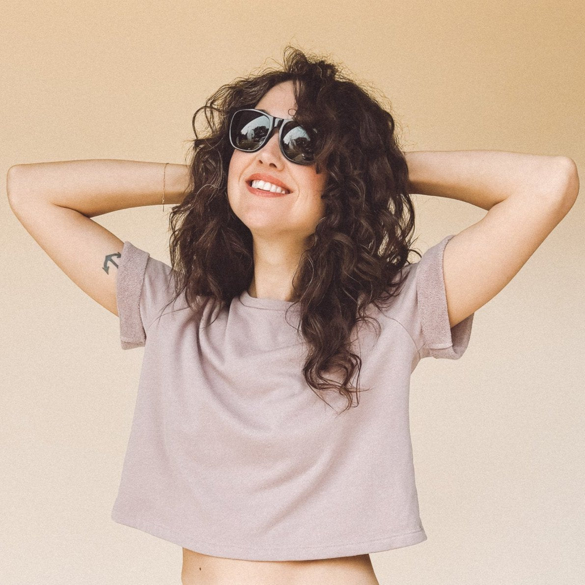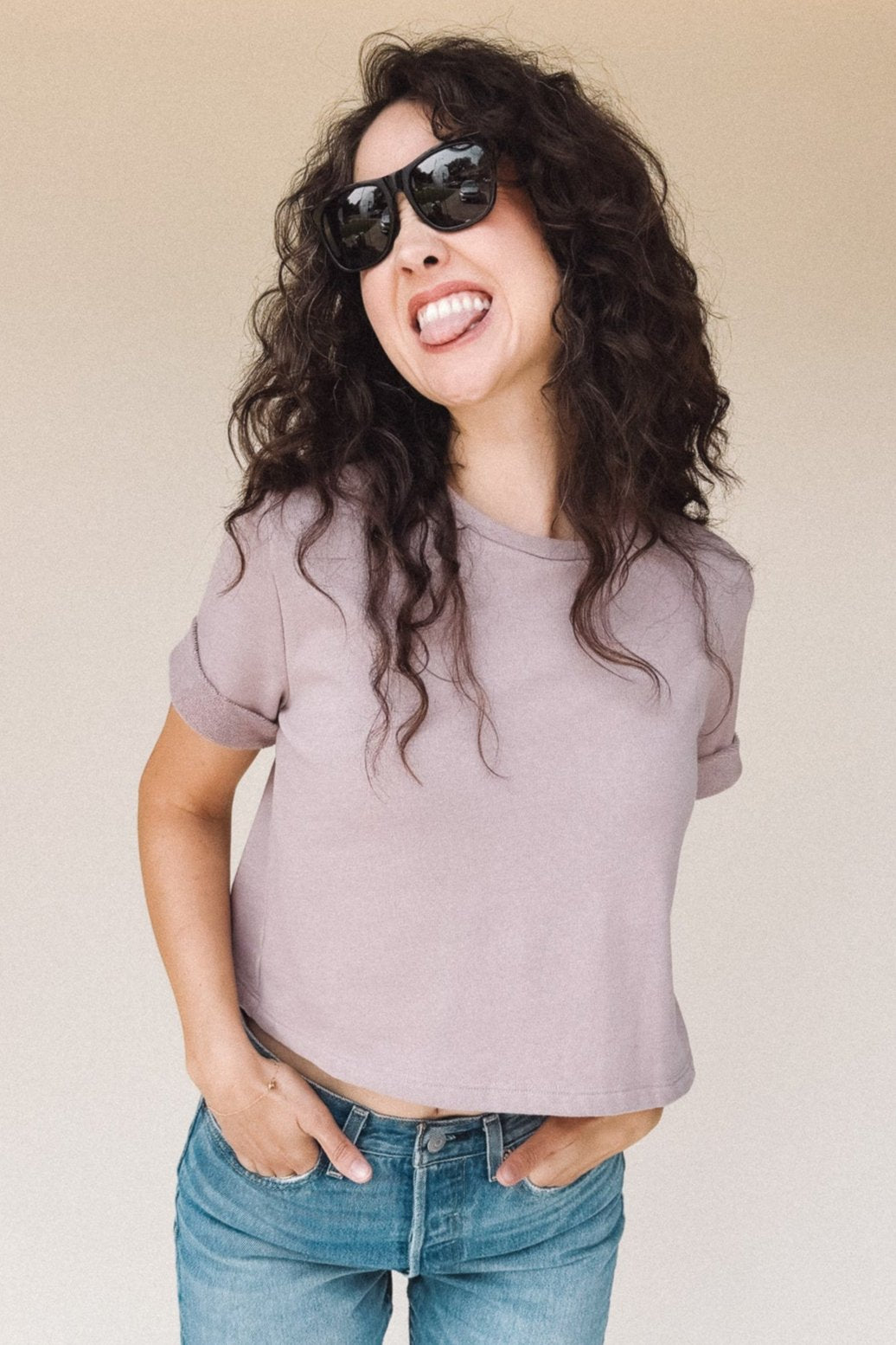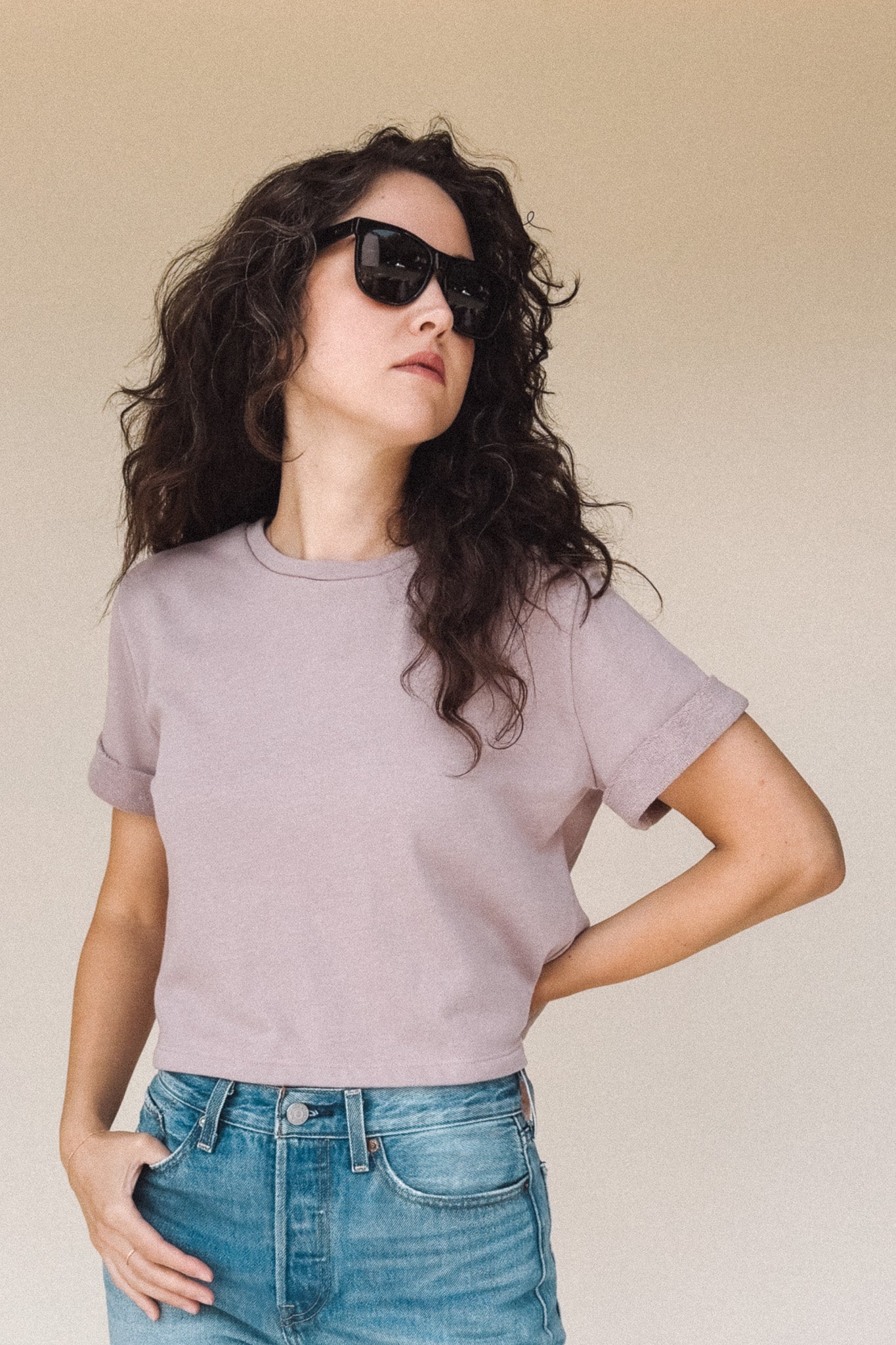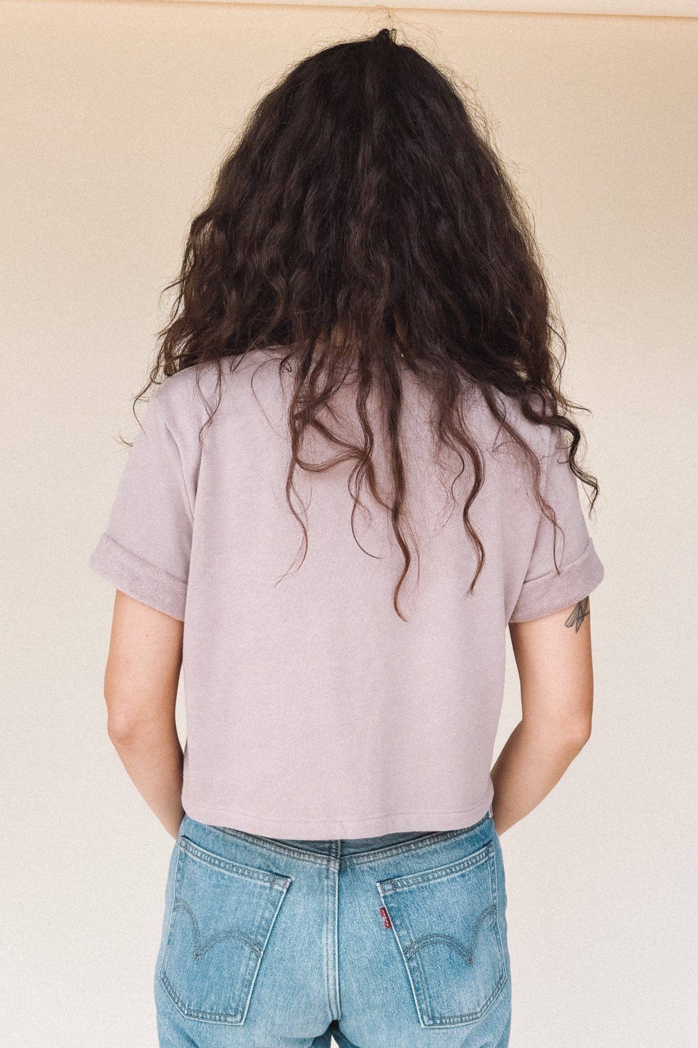 The perfect boxy crop tee in dusty Lilac light fuzzy sweatshirt material. It goes with everything. The one you’ll reach for over and over, the DEE crop top’s understated style is confidence itself.