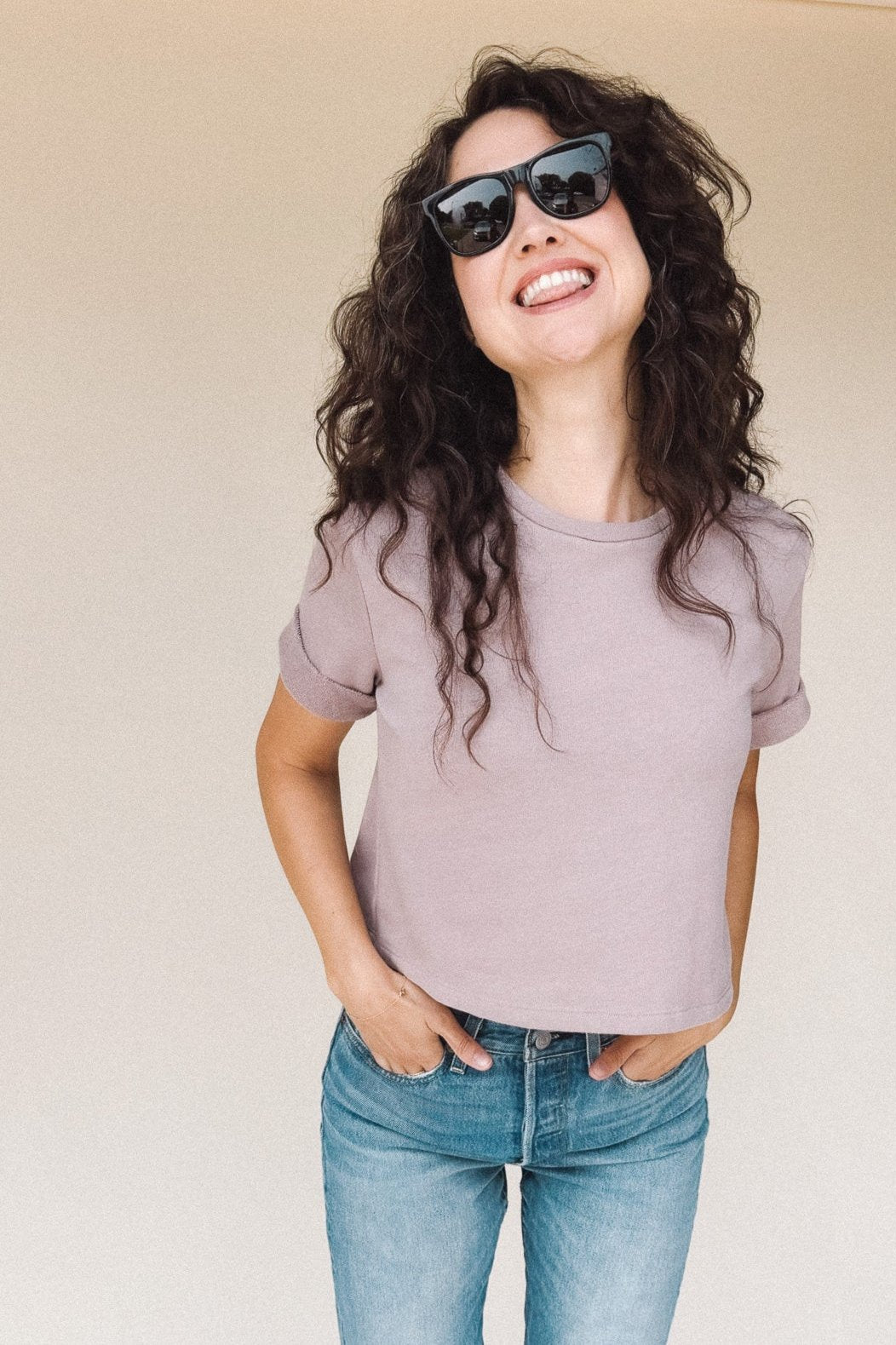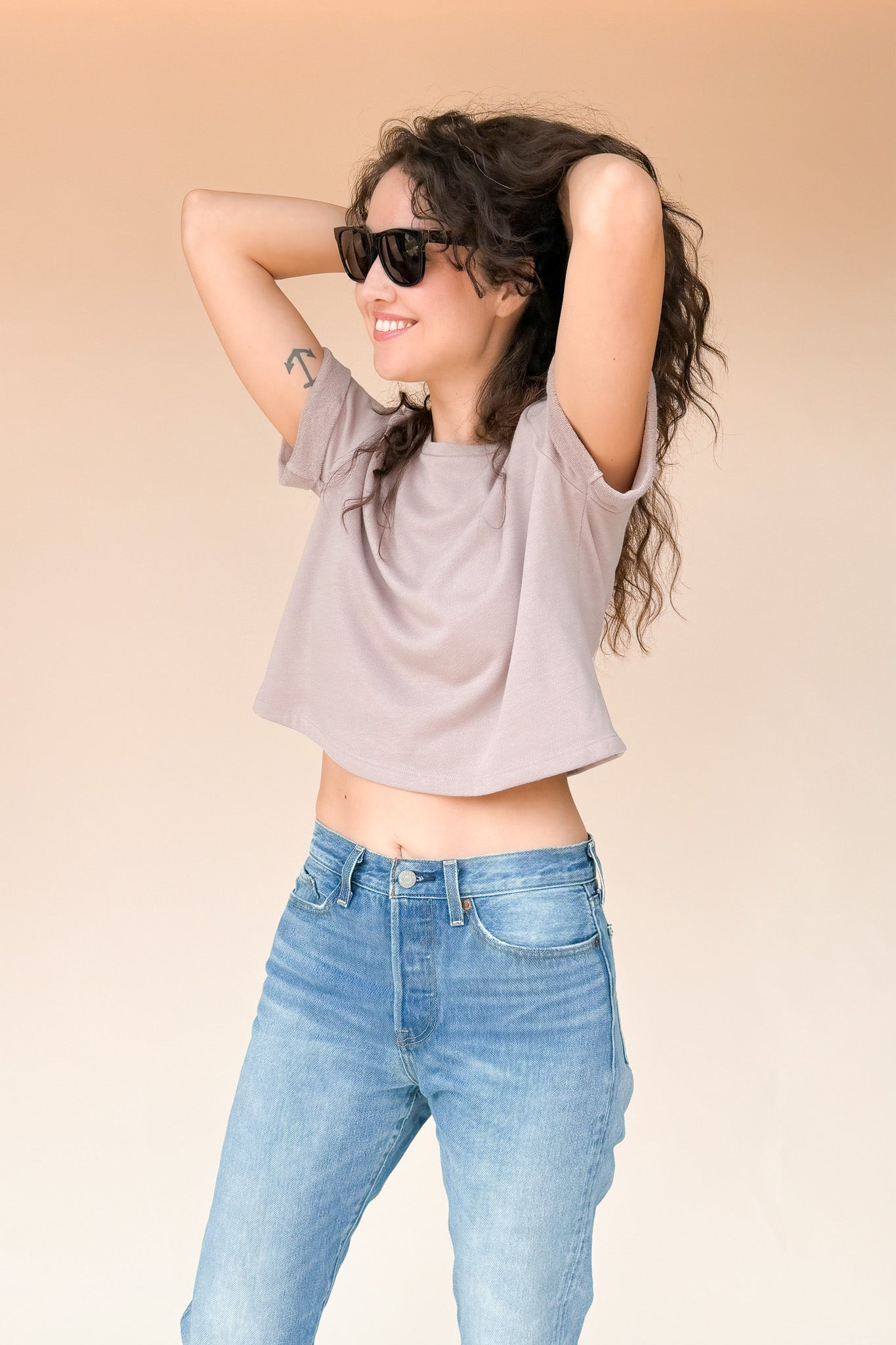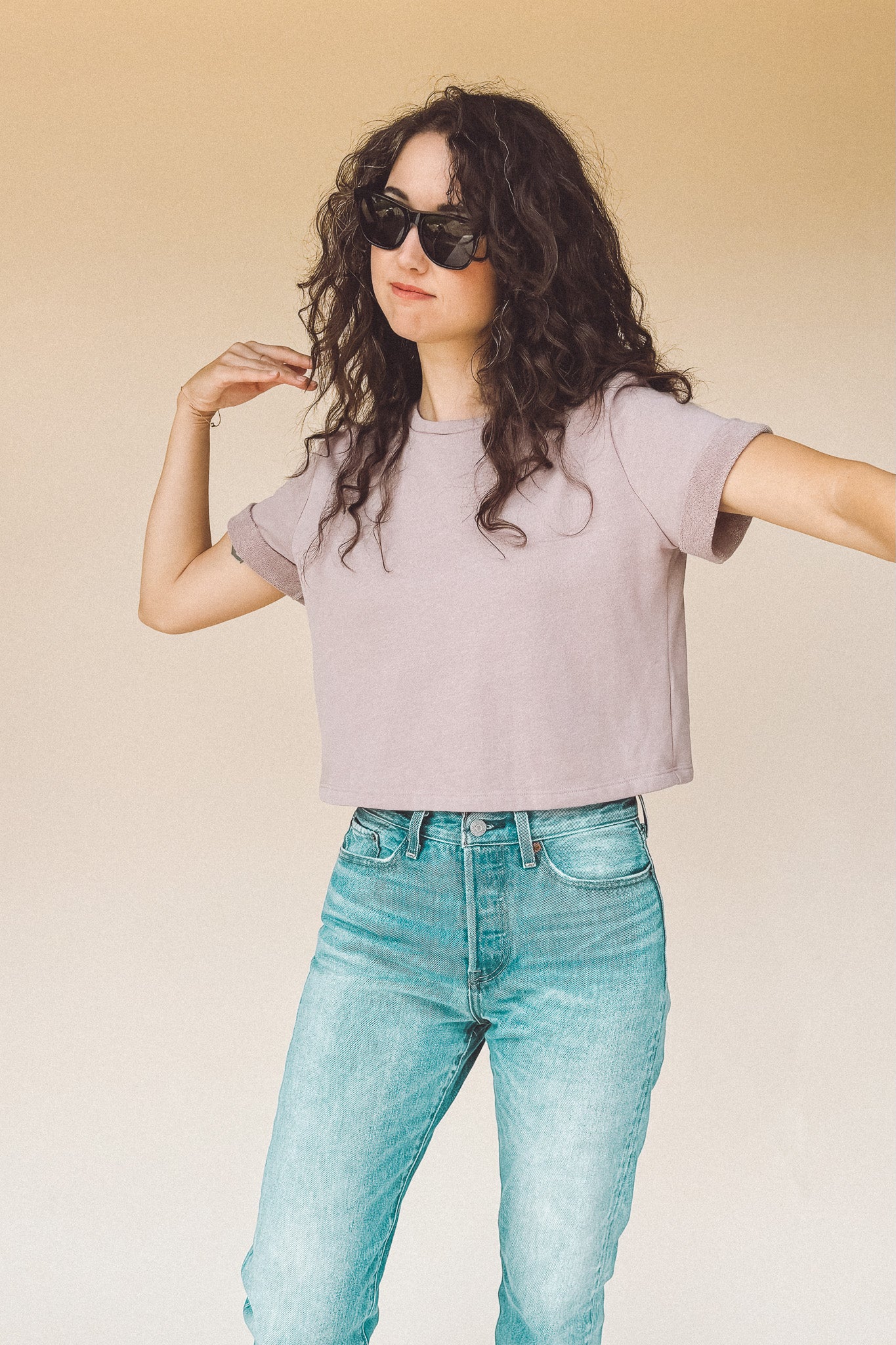 The perfect boxy crop tee in dusty Lilac light fuzzy sweatshirt material. It goes with everything. The one you’ll reach for over and over, the DEE crop top’s understated style is confidence itself.