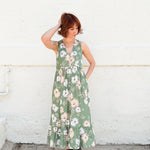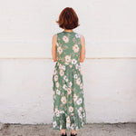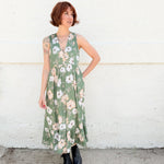 Leah Green Floral button- up,V-neck Midi Dress with hem ruffle – Sleeveless, Button-Up, Deadstock Rayon