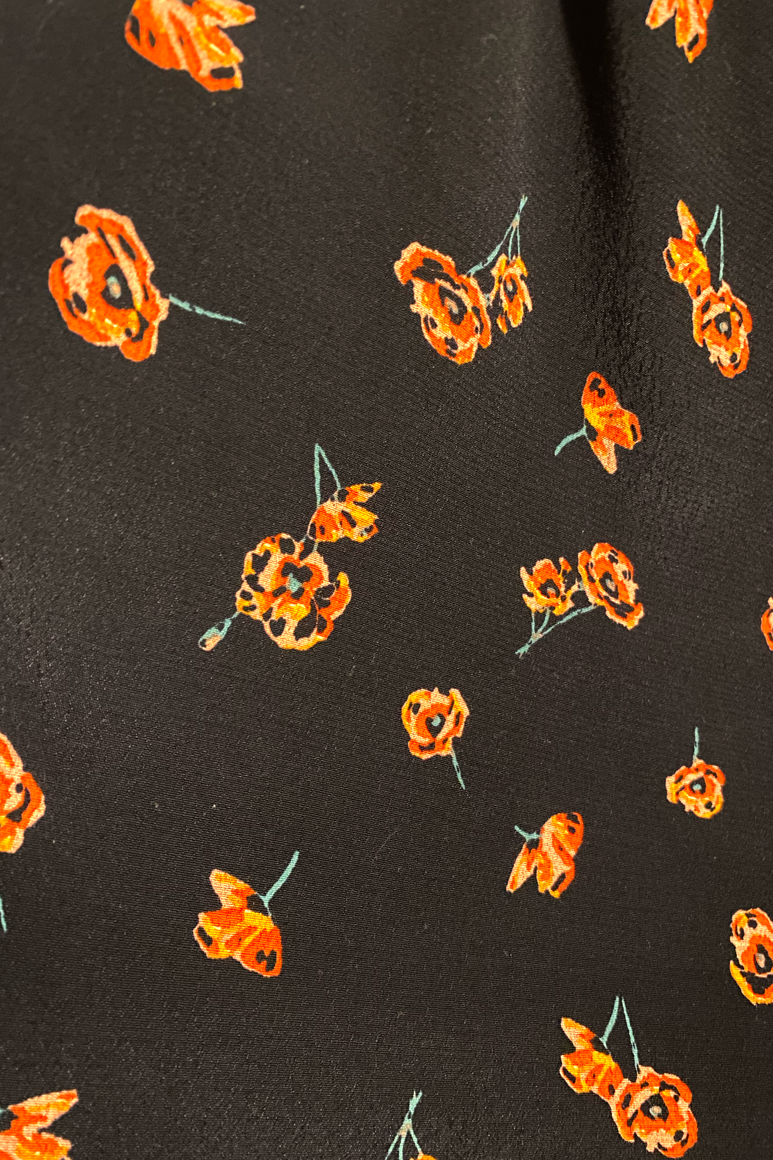 • A perfect California Poppy print to go back to everything. 100% rayon deadstock fabric with a cotton knit lining.